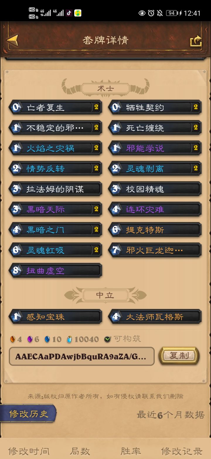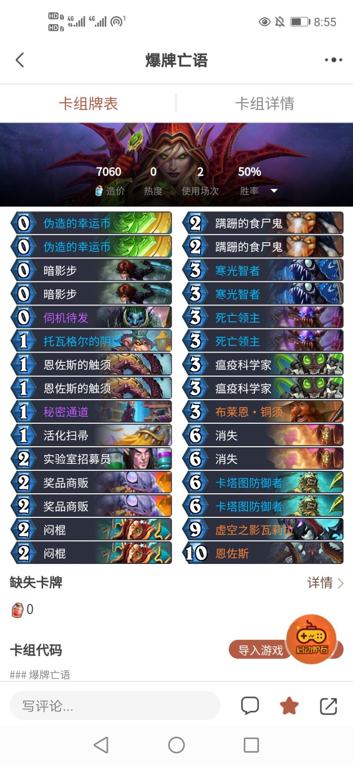 卡组如上,这套卡组的致胜点就在于这张牌利用提克特斯腐蚀后的爆牌效果,强行让对面进入疲劳状态,而自身拥有着大量的回血、解牌、还有迦拉克隆变身后的满地杂毛来站场。亡者复生,一般用于提克特斯翘辫子后,在自己血量健康的时候使用,不仅仅可以用于战场,还可以快乐撕牌可以配合阴谋和688来回血,尤其是面对法师和萨满,及时让688翘辫子不稳定的邪能箭,灾祸,死亡缠绕等法术清场key牌:黑暗之门,稳定拉6
