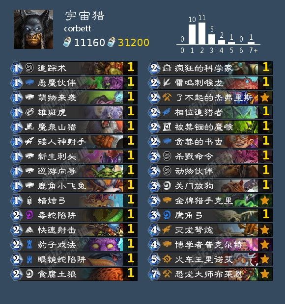 因为9连胜到传说以后打了一轮双职业竞技场,不显示13了先上卡组:### 后五百岁的神级宇宙法 # 职业:法师 # 模式:标准模式 # 凤凰年 # # 1x (1) 唤醒 # 1x (1) 始生研习 # 1x (1) 研究伙伴 # 1x (1) 衰变飞弹 # 1x (1) 霜冻射线 # 1x (1) 魔术戏法 # 1x (1) 魔杖窃贼 # 1x (2) 了不起的杰弗里斯 # 1x (2) 星术