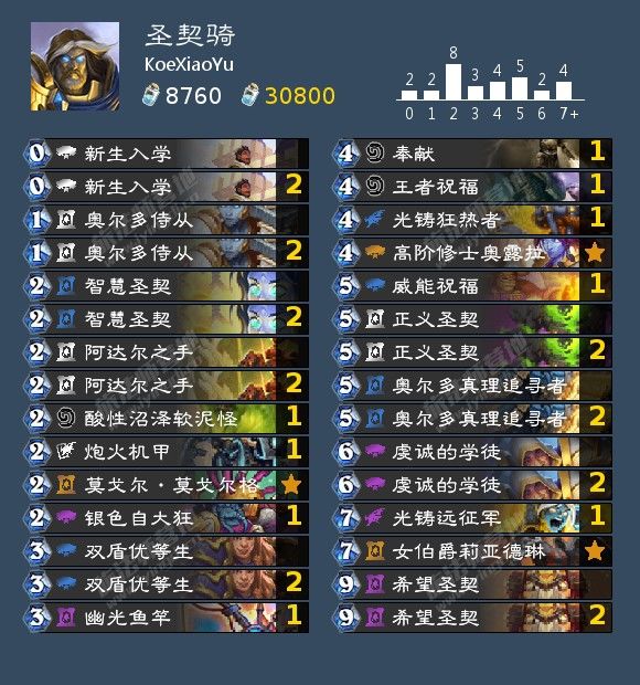 作者:好烦 要开学了今天的卡组是圣契骑,奇迹法,防战,宇宙快攻猎。套牌编码:AAECAaToAgzcA4oHrwebrgOcrgONtgP7uAP8uAOEwQO/0QPD0QPg0QMJyrgD/bgD6rkD67kD7LkDysEDns0DwNEDytEDAA==来自合肥实力赛冠军KoeXiaoYu#5253的实力赛夺冠圣契骑。与黄金联赛中的圣契骑相比,卡组作者中加入了一张酸性沼泽