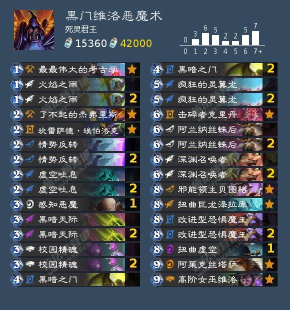 作者:恶魔任务女巫术的卡组攻略。大家好,我是死灵君王。作为术士盗贼职业的绝对拥护者,我非常喜欢这两个高风险,高收益的职业。在上个版本外域的灰烬时笔者尝试了恶魔术好几百场,颇有心得,无奈上个版本DH的蛋刀太厉害,无论怎么组控制术总达不到想要的强度。这个版本则不同了,虽然大家没有注意到也没有特意去开发,但是我认为高阶女巫维洛绝对不是凑数卡,这张卡有能翻盘决胜的能力。试想4费开黑暗之门,5费出个维洛