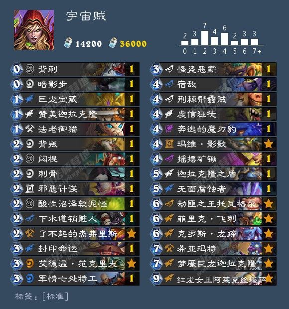 大家好我是一名入坑了十个月的老萌新,作为一名忠实的贼玩家,贼的玩法丰富多样变化莫测深受我的喜爱,新版本加入的几张蓝白卡大大的增强了贼对战时的节奏快感,使得贼在对战时的灵活性更胜从前,大家可以把这套卡组当成娱乐卡组去玩,强度的话上个钻石或者低保应该不成问题(本篇攻略偏萌新,文末神秘代码)总体思路:低费卡前期抢节奏,起手留女郎奥秘刺骨以及低费祈求牌,有恶霸尽量留一张恶霸,后手可2费跳币下恶霸找跟班补
