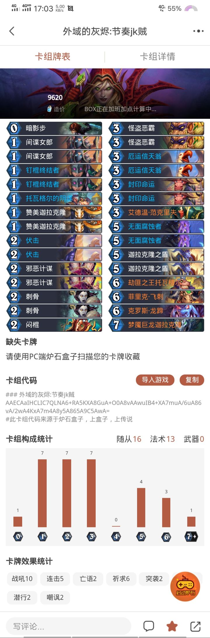 大家好我是小王爵,今天在这里为大家带来的是一套我打上传说的宇宙贼。外域的灰烬上线后,恶魔猎手横行天梯。伴随着恶魔猎手的增多,牧师与JK术士的数量也在提升,而宇宙贼对这些卡组都占有一定的优势。于是我用该卡组针对环境很快上了传说,在此分享给大家。AAECAYO6Ah60AZoCsgLtAs0DiAeKB90Ij5cDkJcDkpcD+5oD/poDiZsD/KMDhKcD9acDt64Dua4Dwa