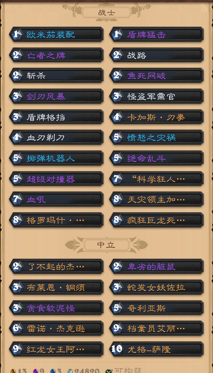 前言:现在狂野宇宙战的定位很尴尬,宇宙体系不如术法牧御三家,前期抗快攻性太差,进攻也就后期几波 所以我打算拯救一下狂野宇宙战这是我目前用的一套宇宙战,和以往的不一样,这套更偏向于进攻,但打大后期拖疲劳也是不虚,因为这套可以分为两个体系,一套dk的,一套dva的,前套可以对付奇数骑这类的铺场快攻,后者可以补充手牌资源打后期。这套我也是刚刚改,希望各位战士玩家留些意见,拯救一下孩子