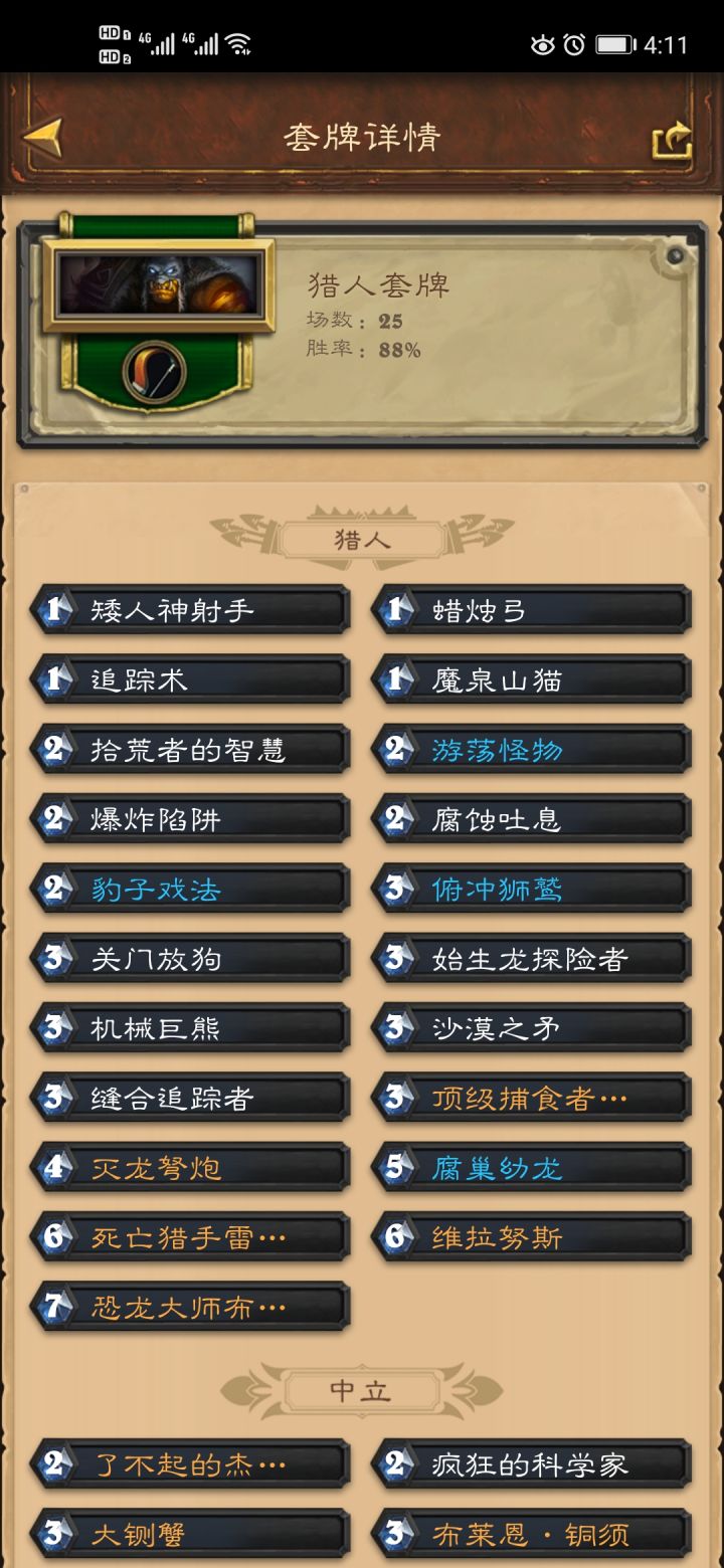 经过上午官方的一系列操作,恶魔猎手也算是经历了一次削弱。但是这样的环境下,DH的热度依然不减,更有人说:标准现在只有两个职业,DH和DHH(恶魔猎手猎手)。那么在这样的情况下,巨化德作为前朝毒瘤,虽然接受了荣誉室和退环境的洗礼,却也是锋芒不减。话不多说,推图在前几天恶魔猎手没上线的时候,打出了11连胜的佳绩。现在恶魔猎手上线了虽然只有两盘,但是效果还是不错的,毕竟DH的爆发还是挺疼的,况且还