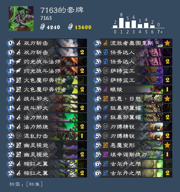 新手玩炉石该玩什么呢,当然玩快攻啦,不是快攻好玩,而是其造价便宜,强度高,操作简单,是萌新上分的利器。快攻一直存在于炉石中,新版本暴雪钦定的快攻职业恶魔猎手更是大大将环境提速。虽说下周又要削了,但是趁着周末赶紧上分吧。————————分割线—————————先上卡组AAECAea5AwbMugPXuwPDvAPEvAPHxgPaxgMMlwb5rgO6tgOLugPgvAO6xgPZxgPV