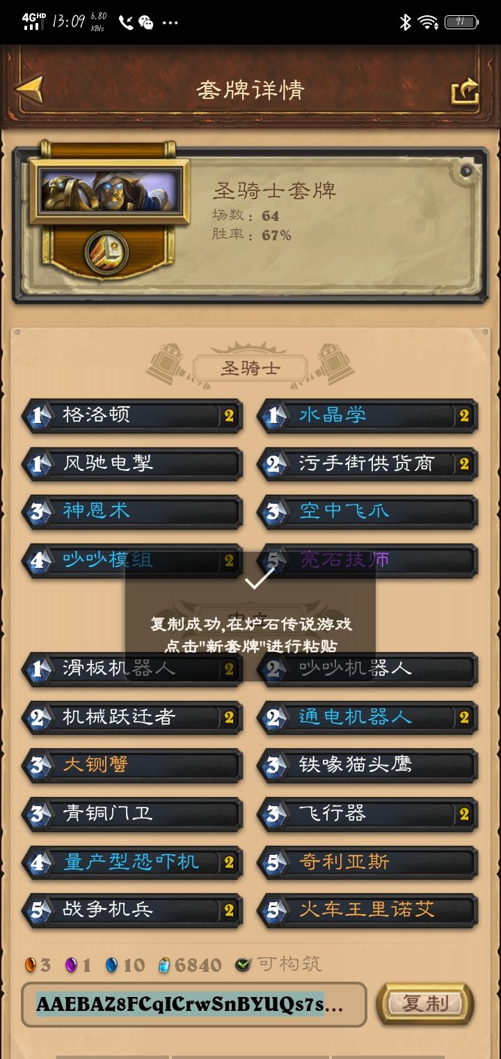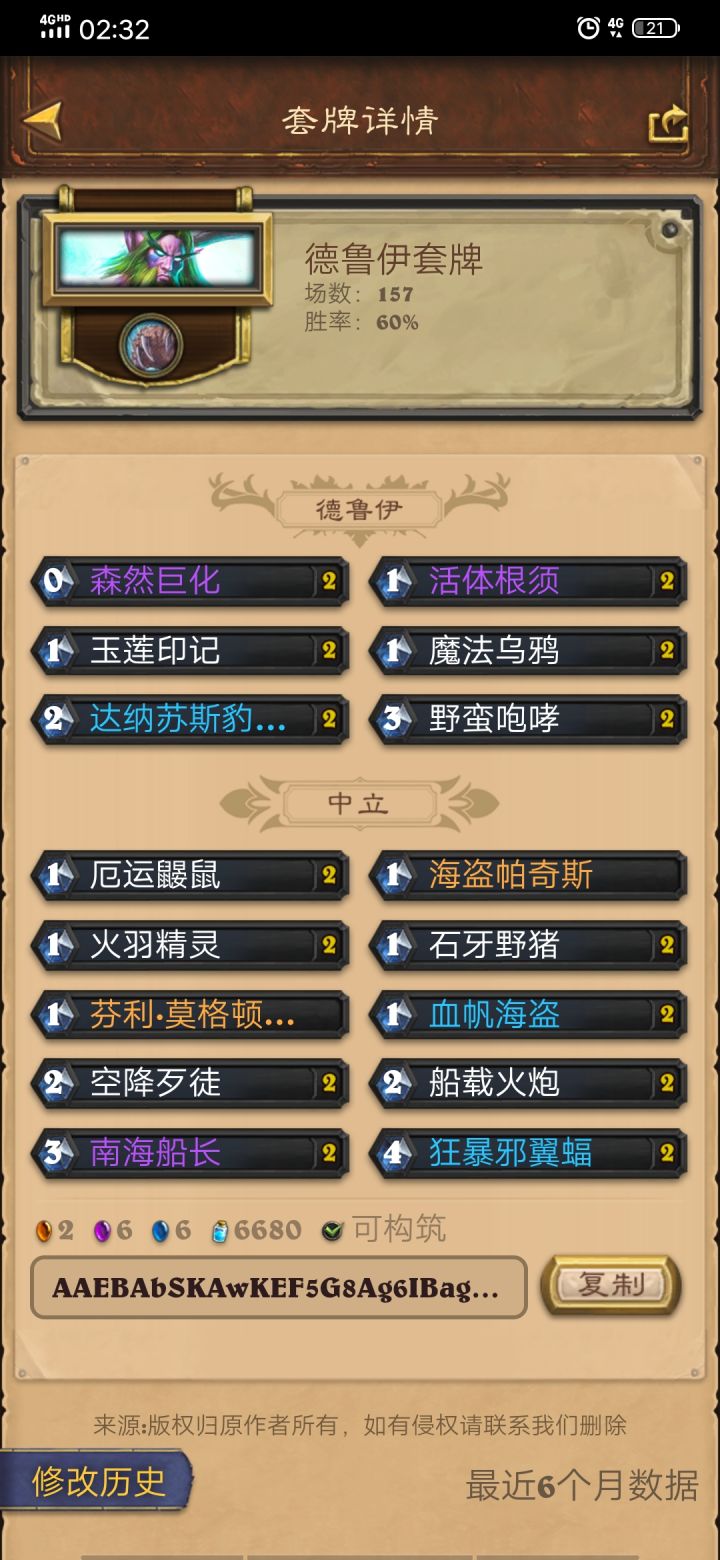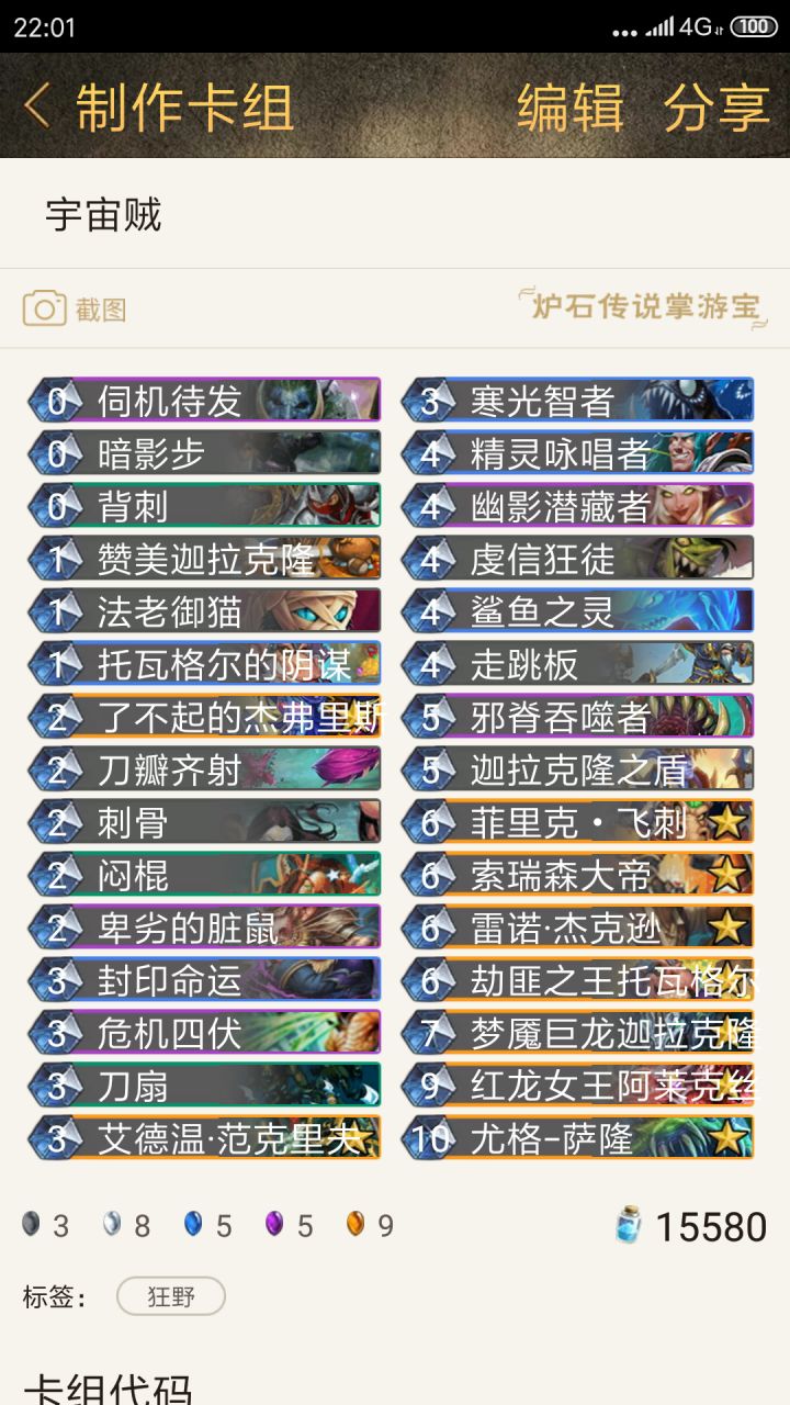 月初传说攻略这是我在钻石五之前所用的卡组,优点是对局快经常连胜,缺点就是也经常连输,但总体胜率可以保持在50%以上可以快速刷星,我这60%胜率还是经历过钻石五互投阶段结果钻石五那个时候好像都没几个人投降,我一个人投了十多把左右,反正有连胜加星的肯定是可以基本上最快的速度打到钻石五的我昨天晚上打上了钻石五总共用了两小时吧,就去睡觉了毕竟早睡早起身体好,熬不得夜。卡组代码AAEBAbSKAwKEF