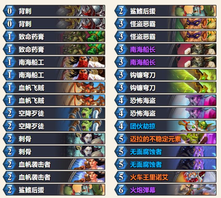 新版本的卡组最近小伙伴们吐槽越来越贵,好不容易组了一套主流卡组再想体验其他卡组就不够尘了,这里推荐给平民玩家9职业的无橙卡卡组,最便宜的一套盗贼只要960尘哦。AAECAaoIAA/TAfkDgQSTCfbwAo/7Apz/AvaKA7SXA8aZA9SlA/mlA9ipA9TJA9XJAwA=胜率:耗尘:3200思路与构筑:在狂野回归后我们免费得到了异变这张卡,这样满编异变也是不要花尘