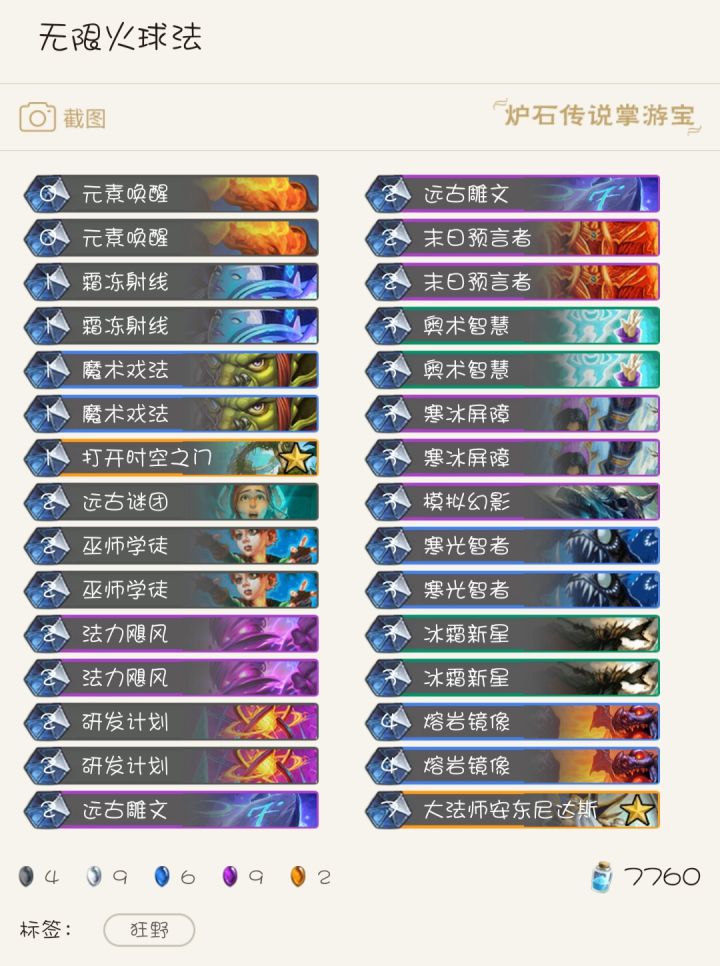 其实只是水水帖,看看什么时候能升3级(*^ω^*) 当前版本最新的无限火球,放弃了传统的香蕉小丑,转而靠法力飓风做任务,区别在于较为灵活,具体如下。 对阵快攻较为流畅,场面紧张?拿不出5费来靠香蕉小丑做任务?或者说就算这回合完成任务也无法启动?而这套你完全不用担心,前期场面随便控,大大加强苟活能力,实在顶不住了只要哀绿在手强行启动,先把3个或者4个哀绿摆上去,然后把手牌上所有法术全部交出去(一般