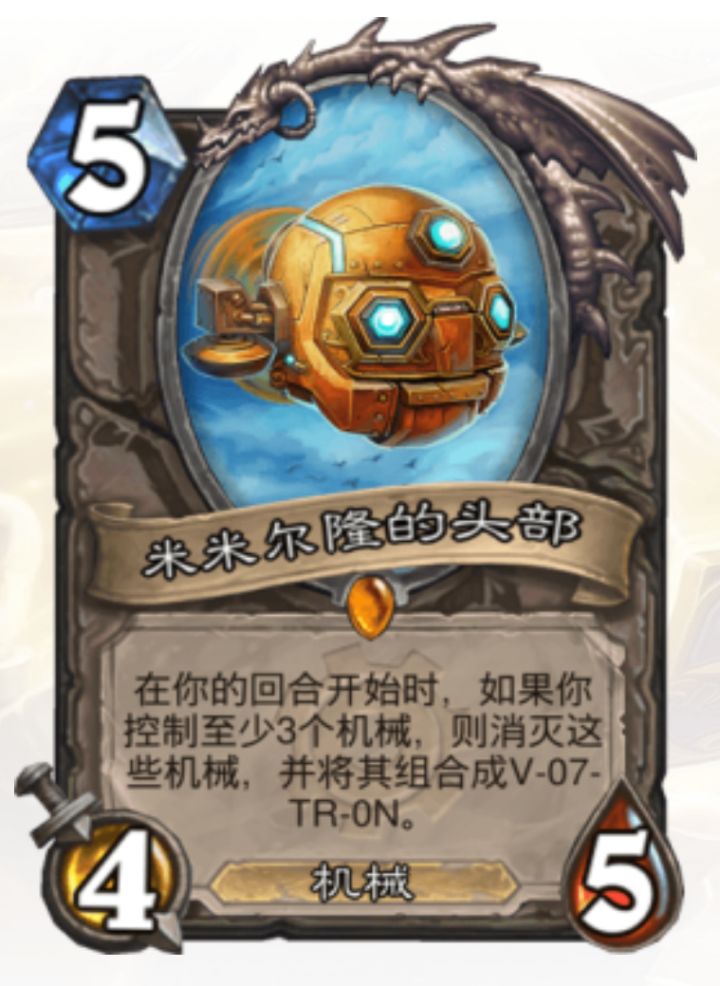 今天小菜鸟为大家带来的就是中立狂野传说机械卡牌米米尔隆的头部,造价:1600尘/3200尘在自己的回合开始时,效果触发后被磁力化,四次打脸就可以结束游戏看来是时候考验场合和技术啦 !