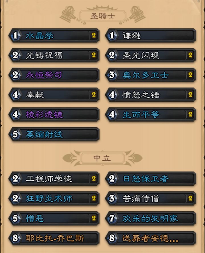 隔了快2年终于打回传说了卡组如下,打了2天分,不断的改卡组,今天终于一口气冲上去了。讲一下如何吃环境修改卡组:如果海军多可以考虑换掉232风怒带上海盗杀手蟹,牧师和术士这种控制偏多呢可以换上一张呱。楼主这套就是平平无奇的偶数萨,为什么用偶数萨冲分呢,第一它便宜;第二它速度快;第三打快攻内战它优势比较大。再讲一下目前天梯环境:按天梯1级来讲,只有大哥牧,各种形态的控制术士和海军以及内战。打
