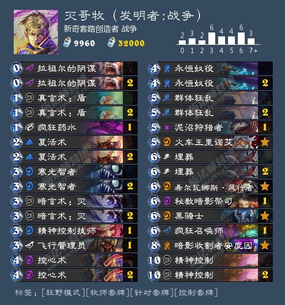 注:本套为针对大哥牧的套牌,仅仅适用于对付大哥牧不想对付大哥牧的玩家请谨慎往下看。各位,我又来了,这次我又做了一套专门打大哥牧的牧师,简称灭哥牧,让我们来继续欺负大哥牧吧。消灭天梯毒瘤,人人有责。打法介绍这一套灭哥牧有三种打法1.给对面召唤随从,污染对面墓地。2.各种解牌抢怪解怪。3.抢过来死后复活。现在开始讲解整套对局思路。开头起手记住必留一张阴谋卡,然后留一张六费以下的解