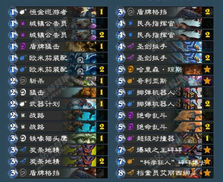 作者:大家好,我又是LFMOrange#5302,咦我为什么要说又呢?在11号打上传说,打出12胜之后,我试图继续向上冲分,但是很快我就感受到了这个卡组的一丝不顺手。在较低分段可能并不明显,但是高分段大家对节奏把握的都很好,埋雷体系的弱节奏高后期回报成了一个比较大的缺点。为此,我对卡组重新进行了构筑,以下是我打到前百用的卡组:新版本伊始,我选择了构筑炸弹防战,一是因为炸弹的思路和防战十分契合