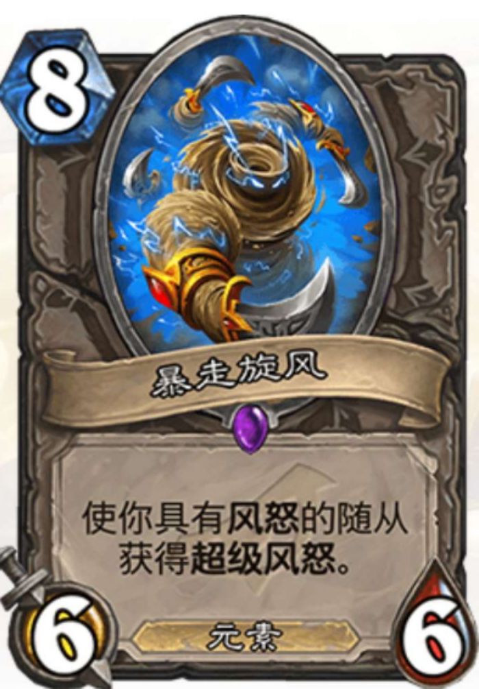 一张很多人看来华而不实的牌,866的高费血亏身材,苛刻的触发条件,很多抽到这张卡的人可能都会顺手一分,叮,100尘到手。因为目前的环境风怒少而大多较亏,与这张牌形成配合很难做到。但对于偶数萨而言,这张卡或许会成为福音。众所周知偶数萨是一个靠优质随从战场,一jio一jio踢死对面的卡组,但偶数萨最大的缺点便在于斩杀线得靠风怒+高质量随从站住场,一般最高也就14~16,有时还得过个墙,导致很多场面难