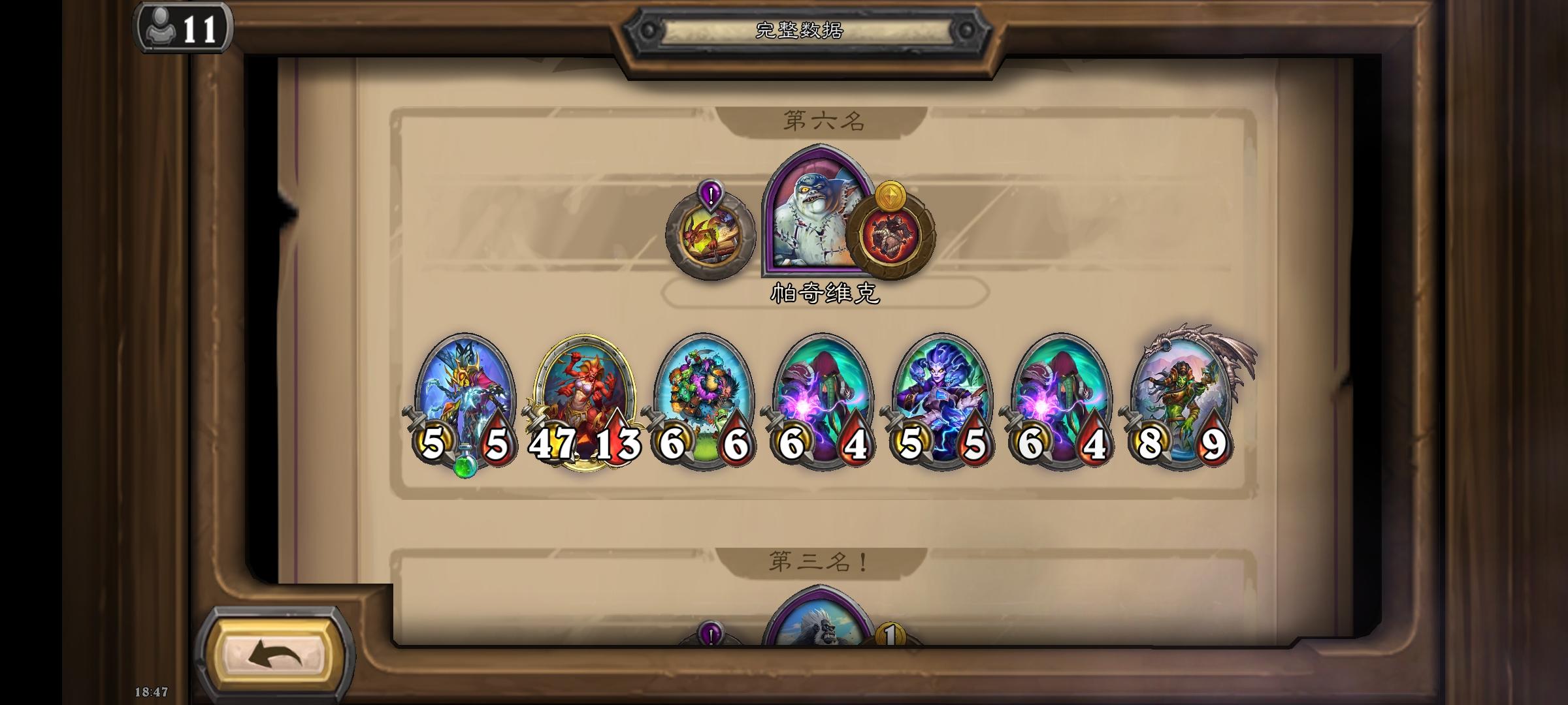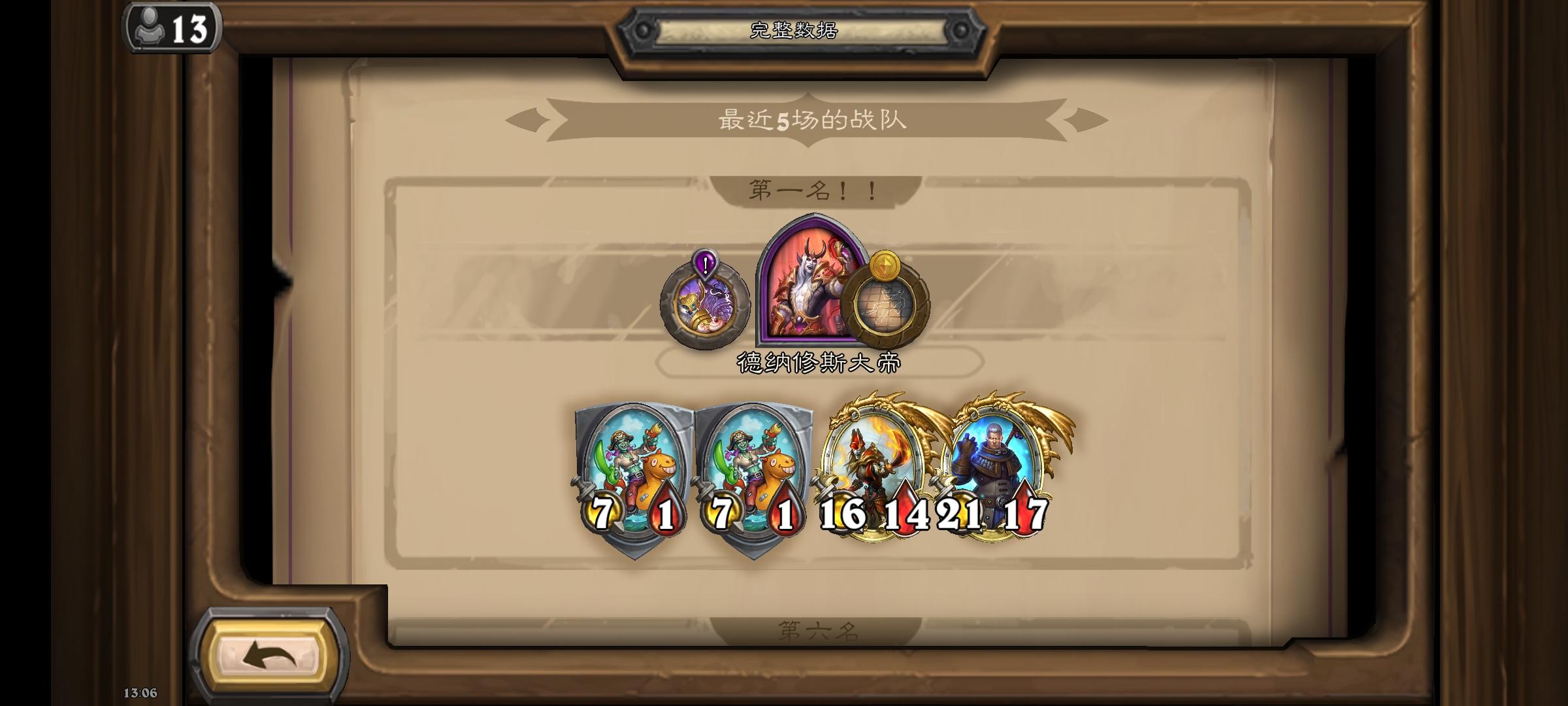 12连胜终结比赛,满血4甲,本来以为这里能看出来的,就没截图。各位也可以去试试这个组合,没有鲍勃+发现鱼+小虾眼之前就能开刷,有了之后手牌都打不完,可惜最后没找到瑞文