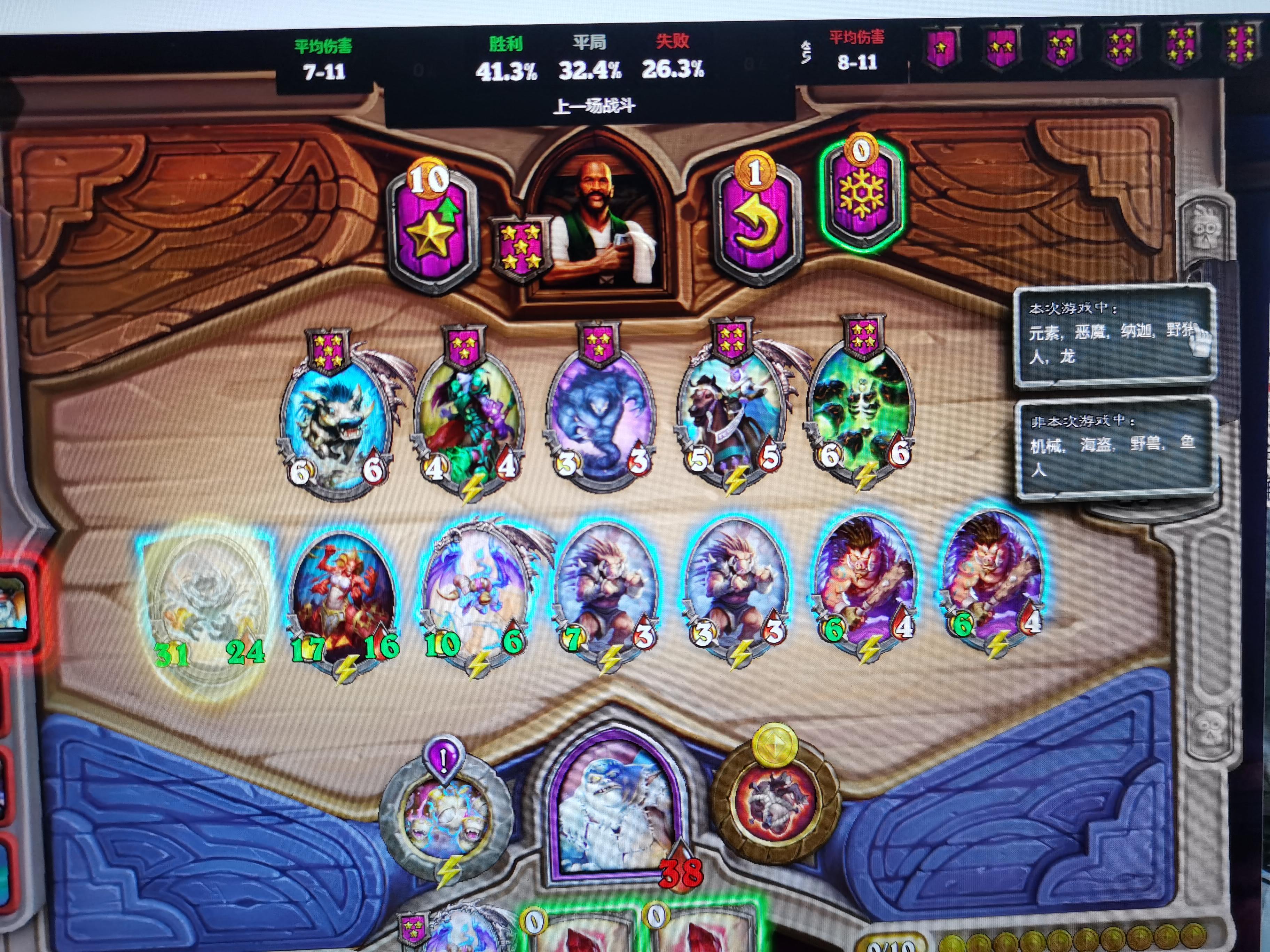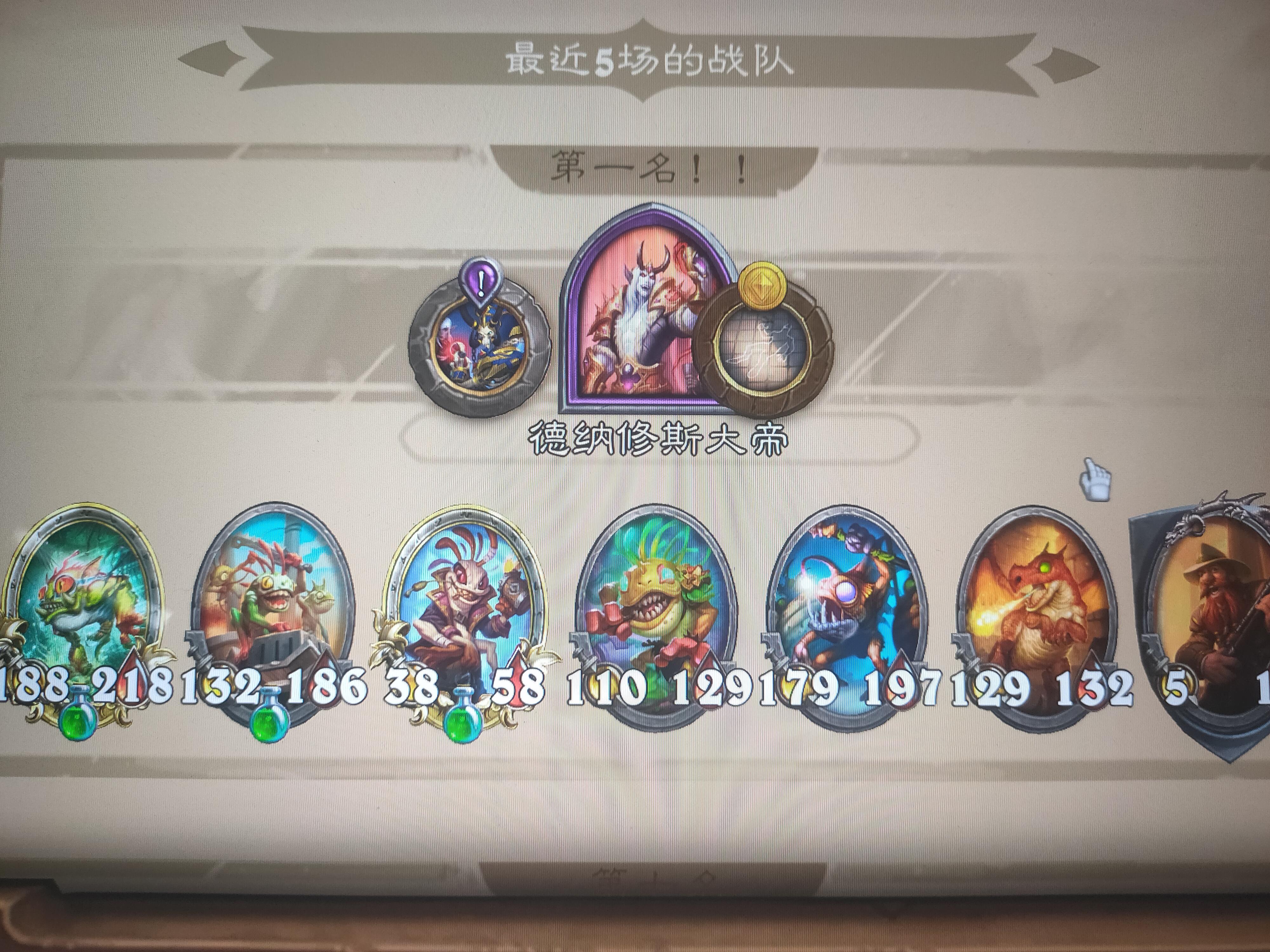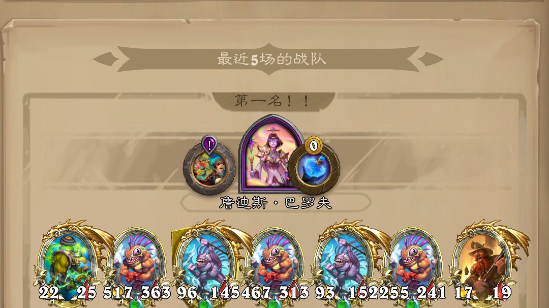 大威天鱼,带爹吃鸡。任务是神灯。打12张元素或者鱼人。碰五的时候出了铜须爹,商店里有发现鱼,然后瞬间卖掉其他随从,配合技能战吼了四次,找了两个筋肉鱼。。。任务也完成了。上一回合大家都是10+来点属性,我碰五这一回合瞬间蹦出一个70/40的金筋肉鱼和一个30+属性的白筋肉鱼。加一堆乱七八糟的战吼鱼,开始点名。然后下一回合升本碰六马上出了小瞎眼,配合发现鱼迅速全员镀金,每合都操作不过来,然后我