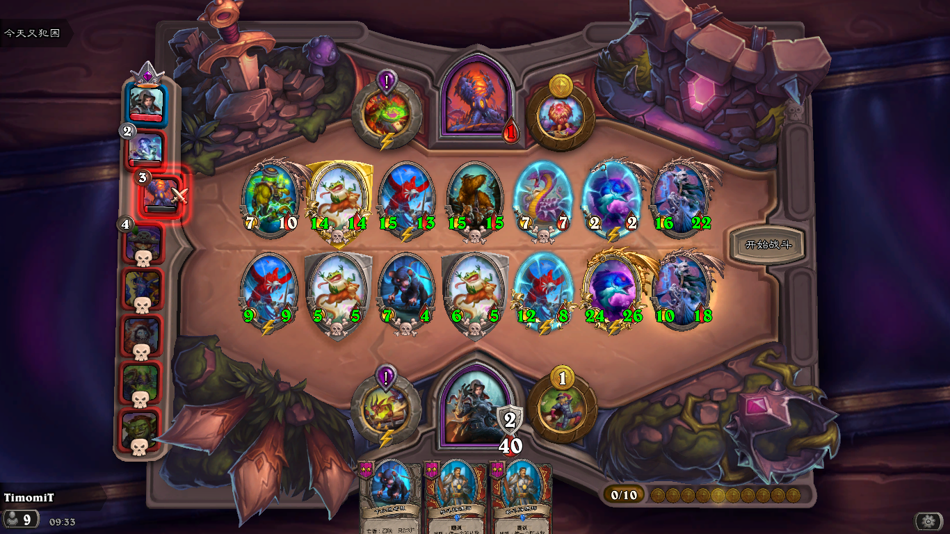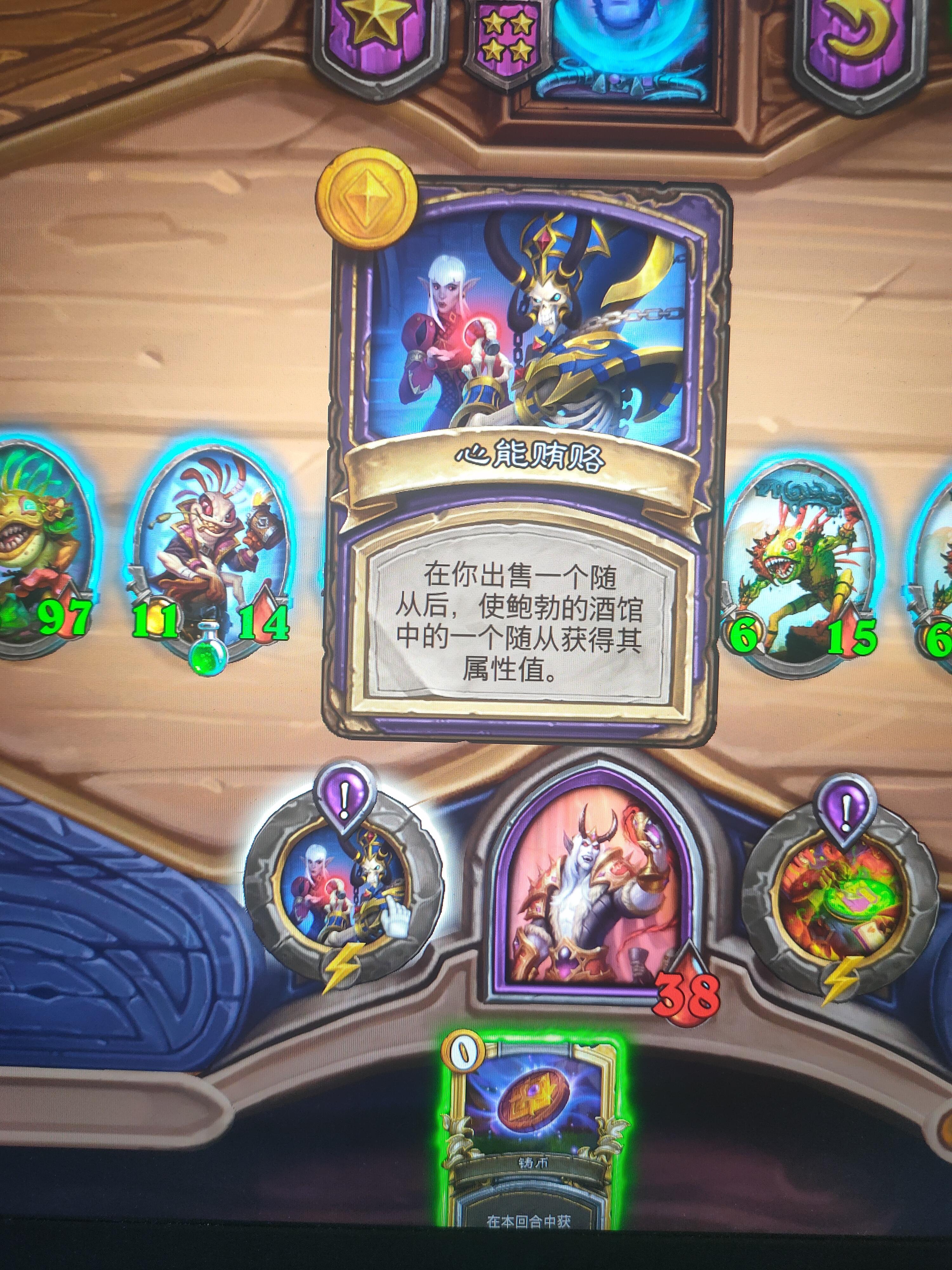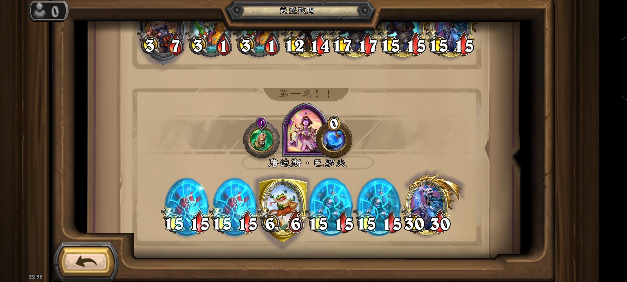 大威天鱼,带爹吃鸡。任务是神灯。打12张元素或者鱼人。碰五的时候出了铜须爹,商店里有发现鱼,然后瞬间卖掉其他随从,配合技能战吼了四次,找了两个筋肉鱼。。。任务也完成了。上一回合大家都是10+来点属性,我碰五这一回合瞬间蹦出一个70/40的金筋肉鱼和一个30+属性的白筋肉鱼。加一堆乱七八糟的战吼鱼,开始点名。然后下一回合升本碰六马上出了小瞎眼,配合发现鱼迅速全员镀金,每合都操作不过来,然后我