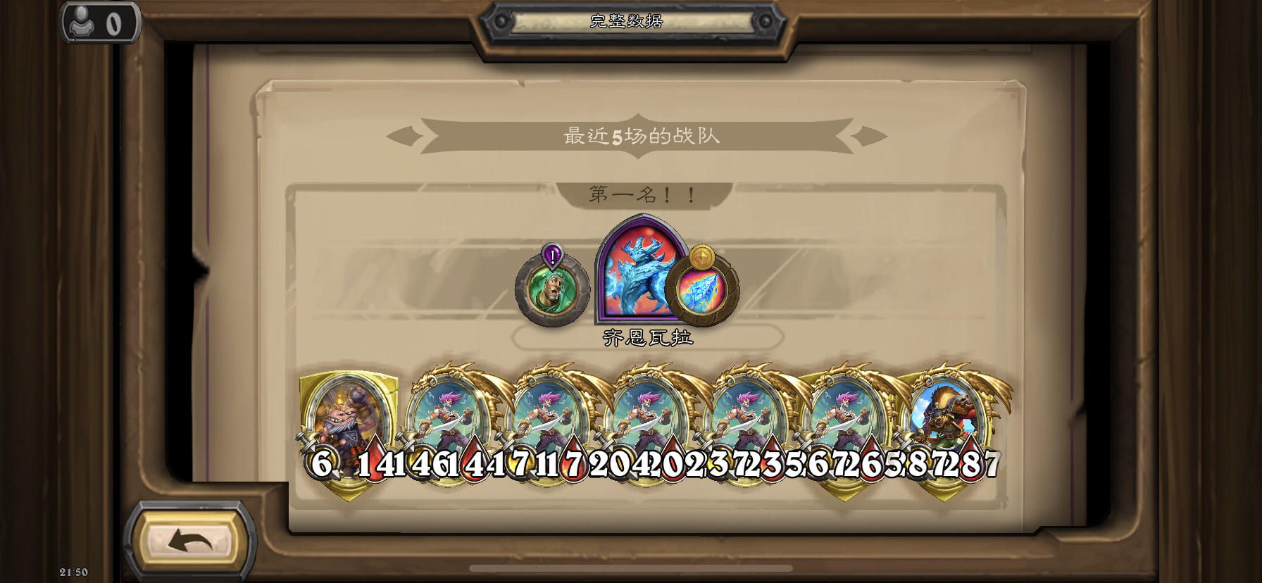 8费出瑞文,手里鹦鹉+蛙,直接从4速6,然后一直在抬人,我都6本好几个回合了,其他人才5本,可惜找不到+15,+15,只能拿1-2小防一手猎,毕竟其他人最高才5本,最多对个普通猎,金猎可能性太小