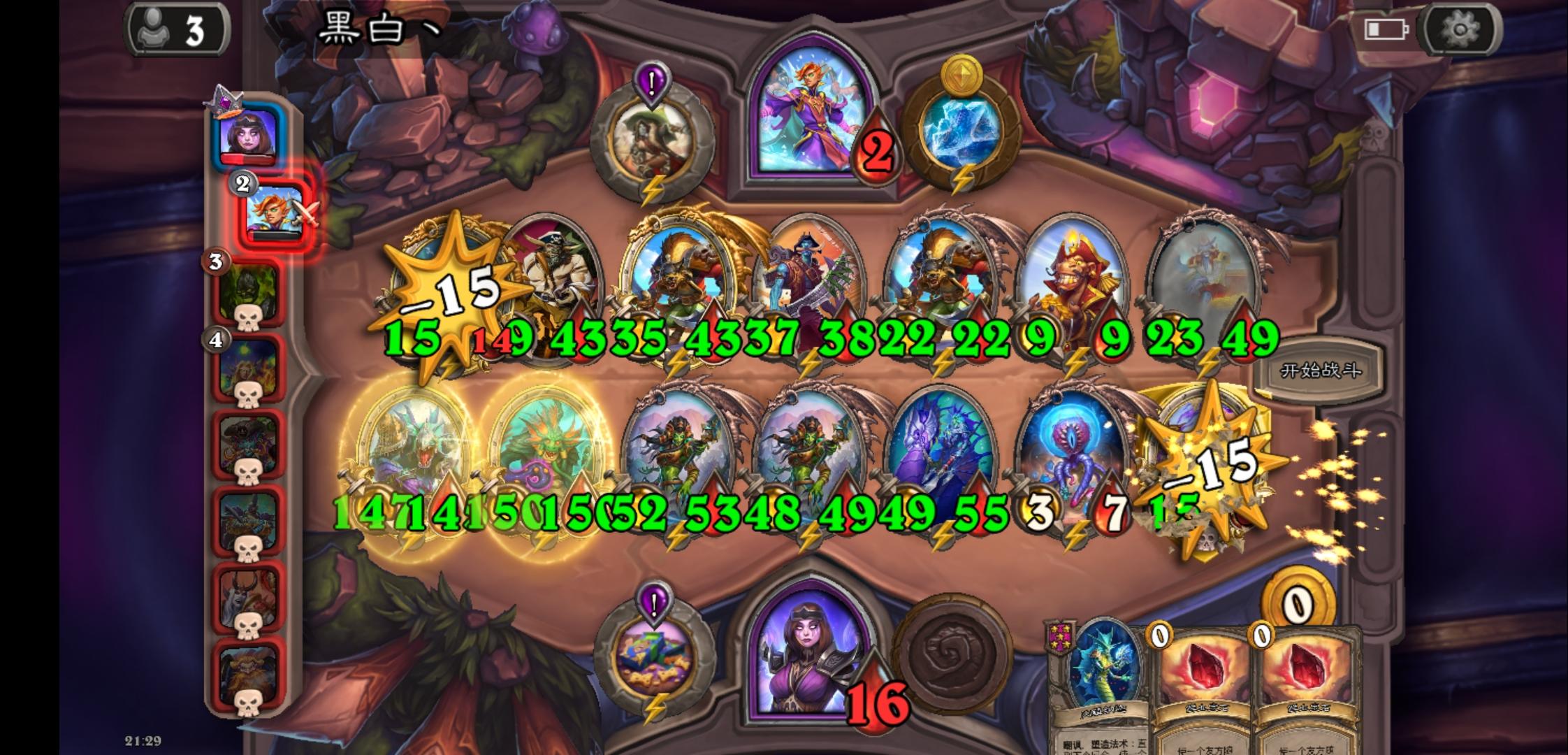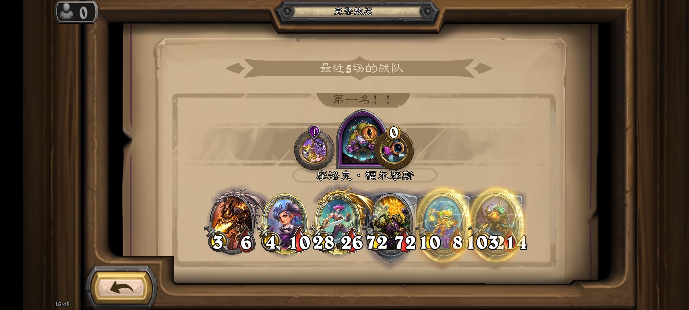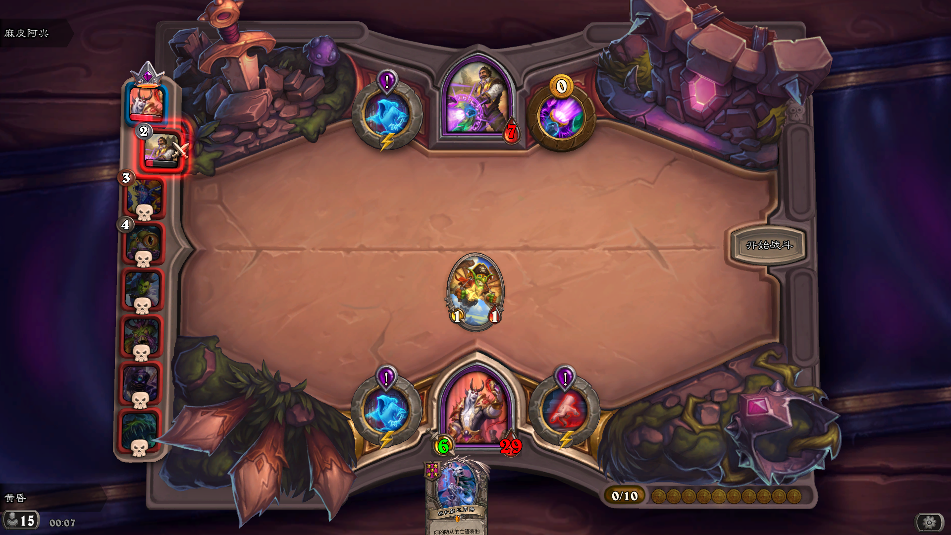 天梯玩家,3500分的局,任务奖励是回合结束生效两次,给一个光牙,走的自动化路线,感觉是我本人有史以来玩的最好的一局,有待完善的是左边第一个野猪人应该换那个风怒圣盾的那个五星野猪人,融合怪也没有贴毒,可惜这局一下子就结束了,没有时间完善了。