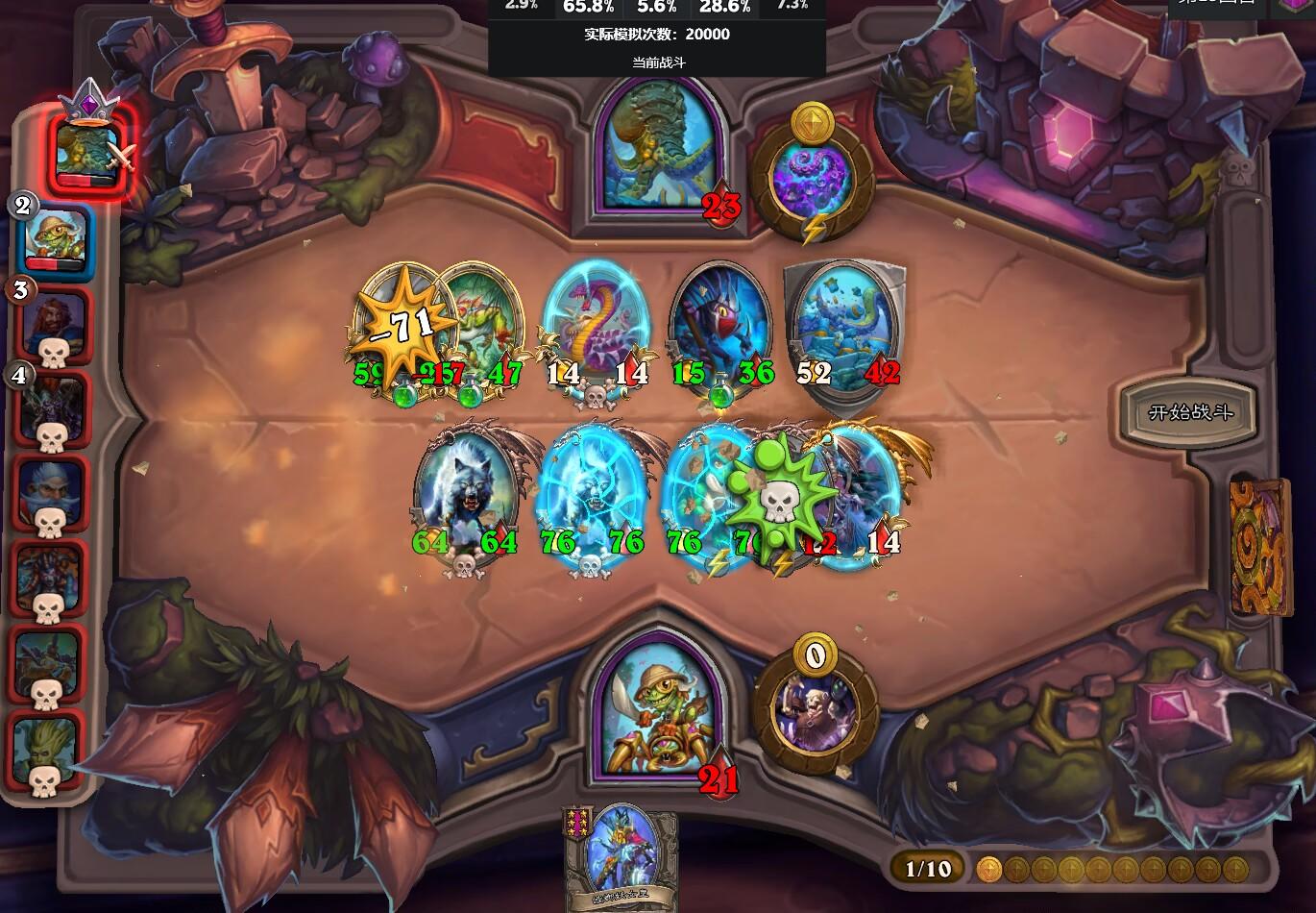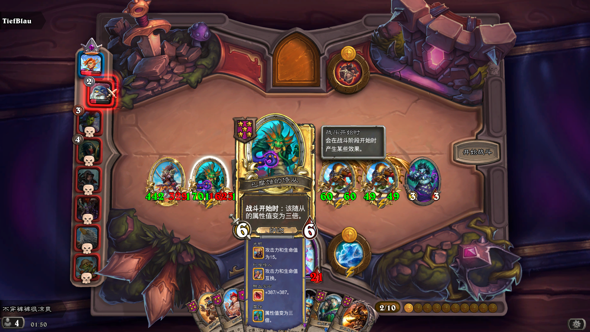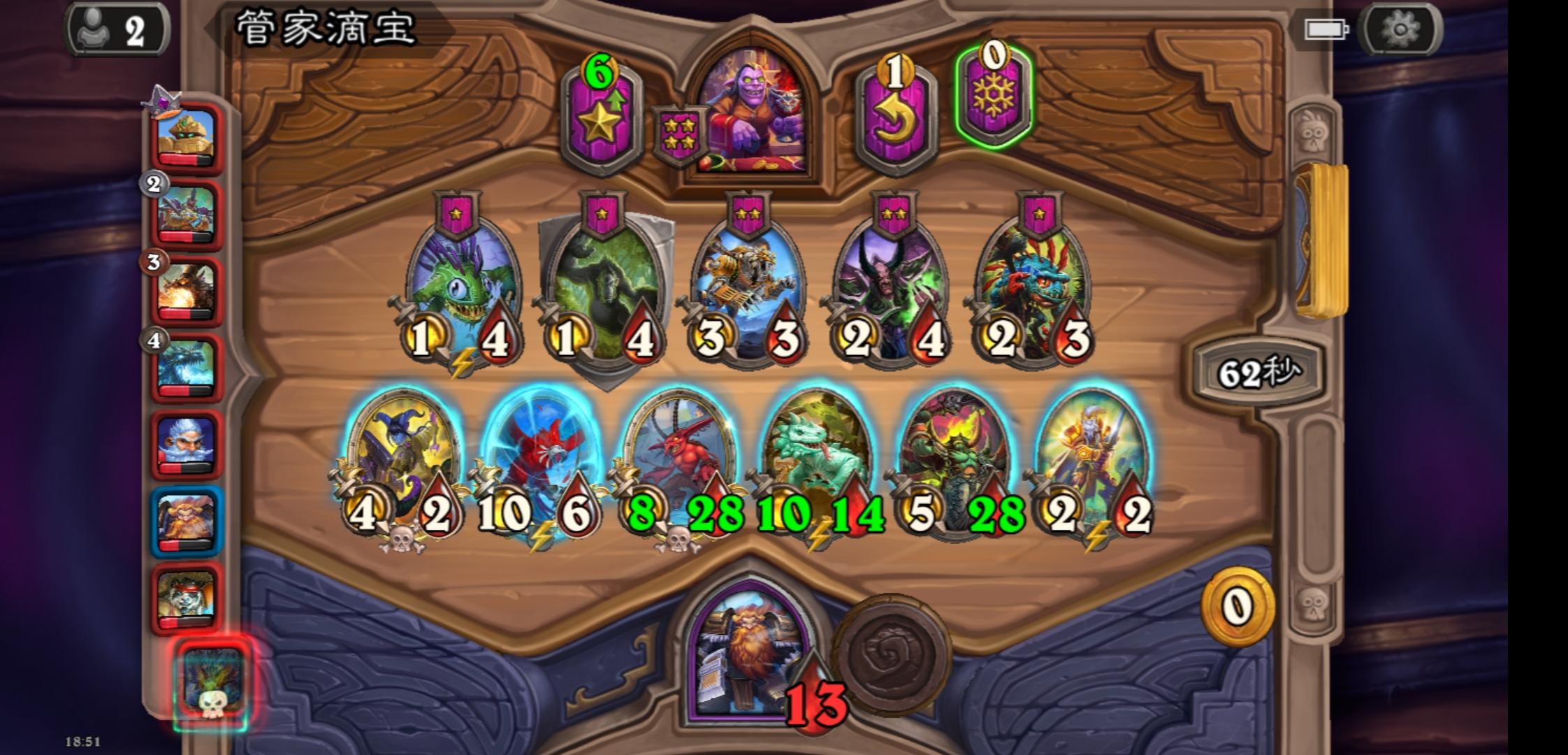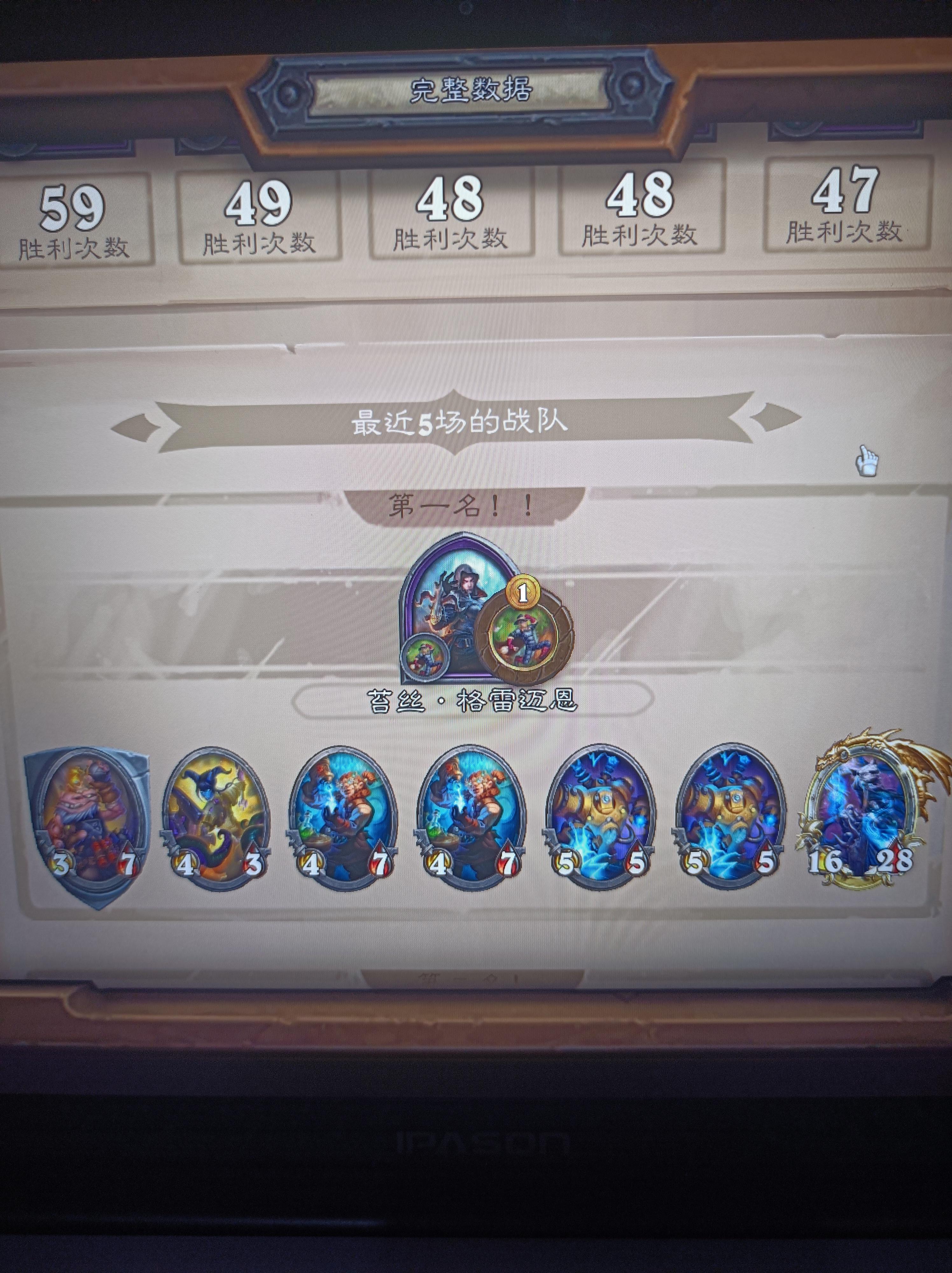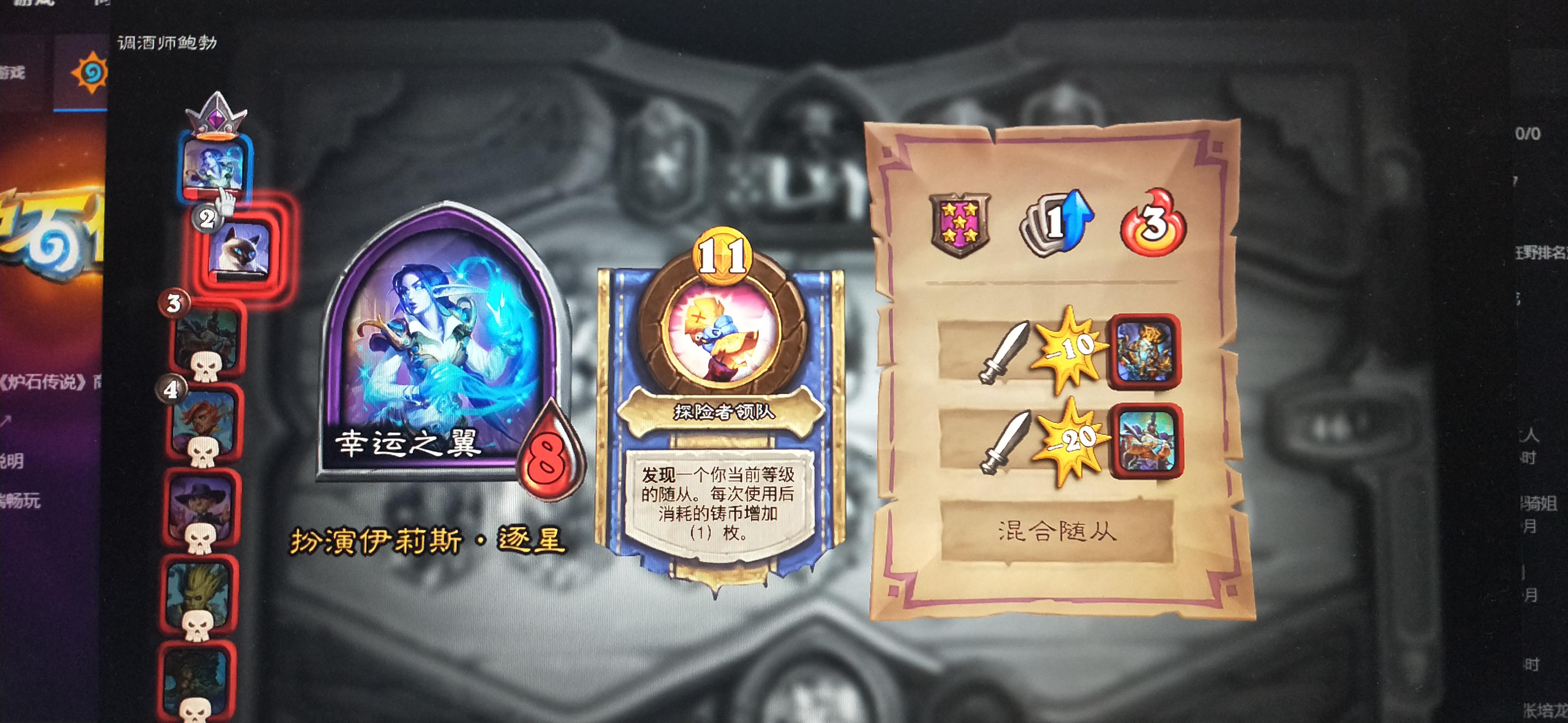 奖品对局,一本先搜到两个对子,对五出鳄鱼瑞文先锁血,中间出了个斯德尼技能脑血栓了给瑞文点了一个,只能含泪先卖了。不过同时来了复生蛇贴给鹦鹉宝藏给升本减五上本找到白狼,战力还行稳得住。然后下回合瑞文就回来了,暴龙三连对出另一个白狼,之后就是平平无奇搜拿全金豪华。最后厄祖应该是宝藏点了个金猎马,吓我一跳,不过刷的是伊利丹的技能,还有个螳螂妖挡着,随便猎