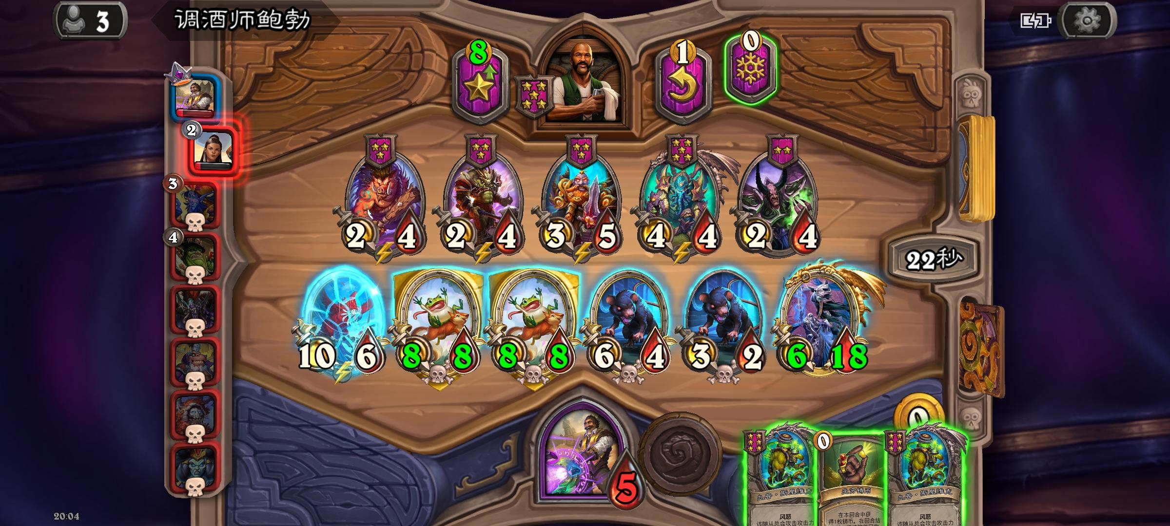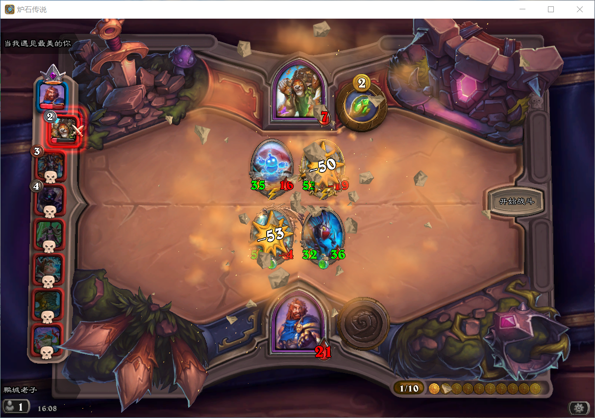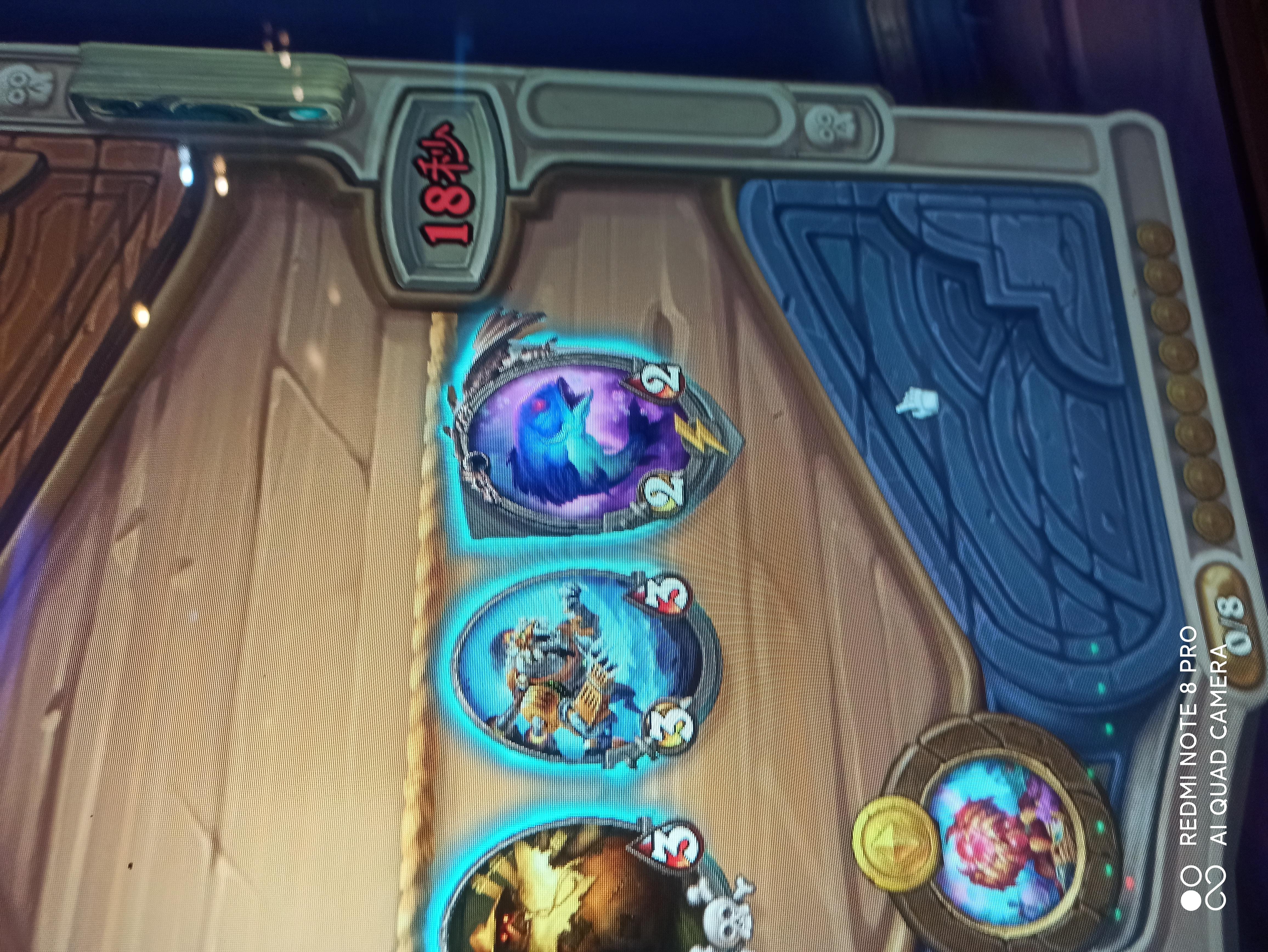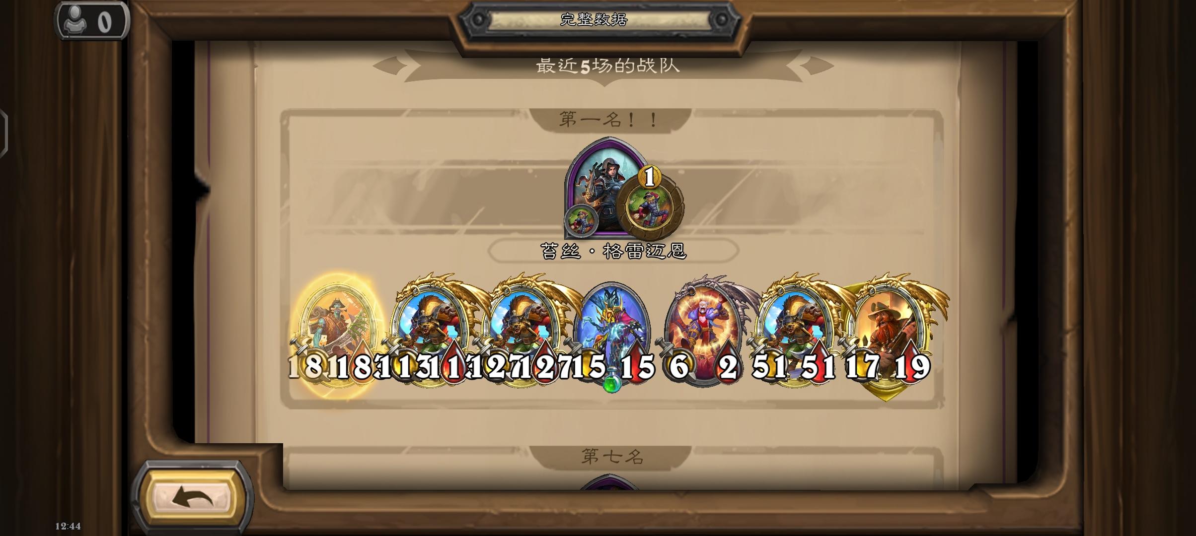苔丝偷到两个三连,直接第6回合升4本找到霍格和金牙,无敌!电表狂转,手机都卡掉线了。不过这局一直找不到海盗战吼,身材有点小。最后打毒鱼买了一个螳螂妖和火车王