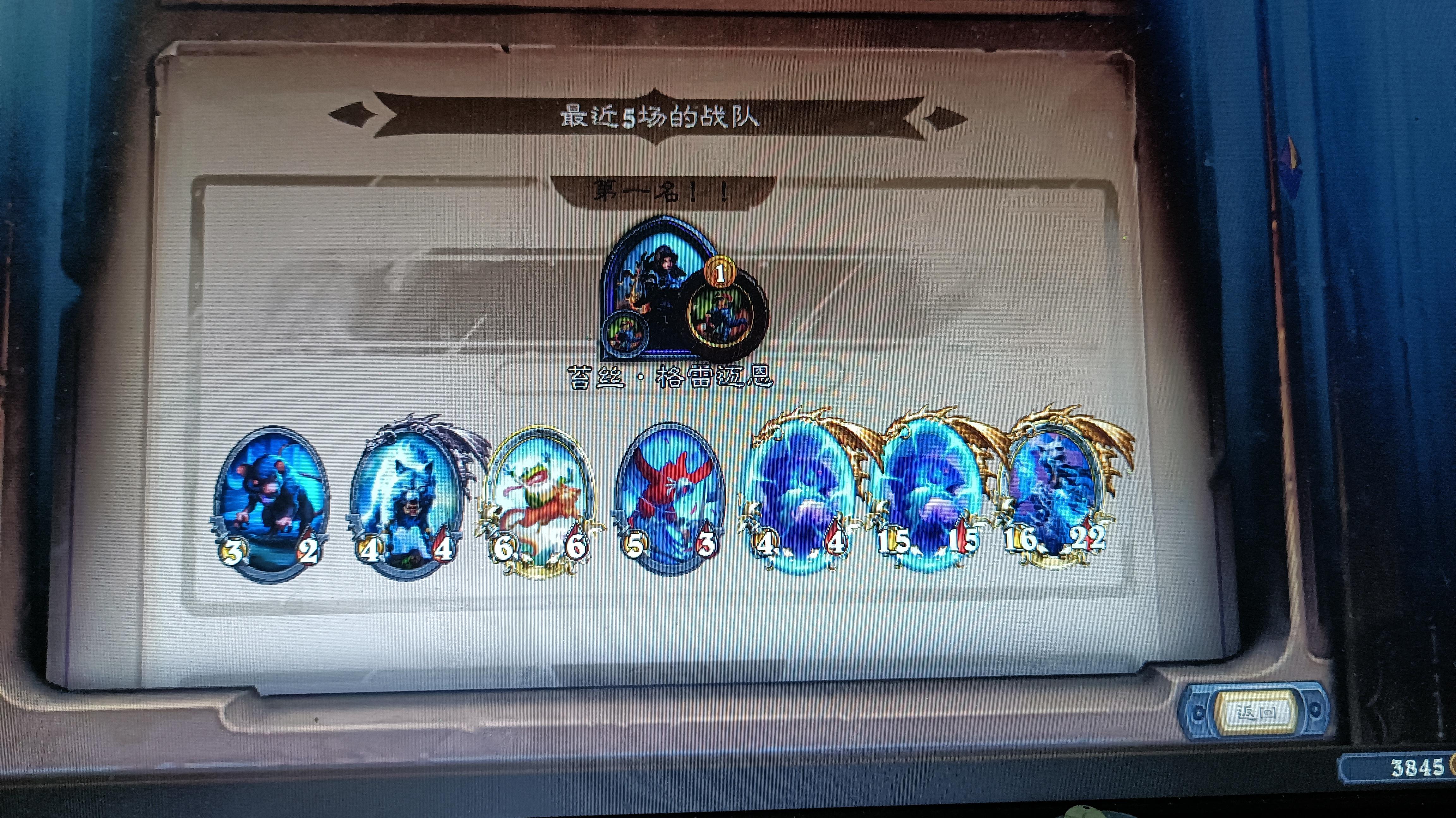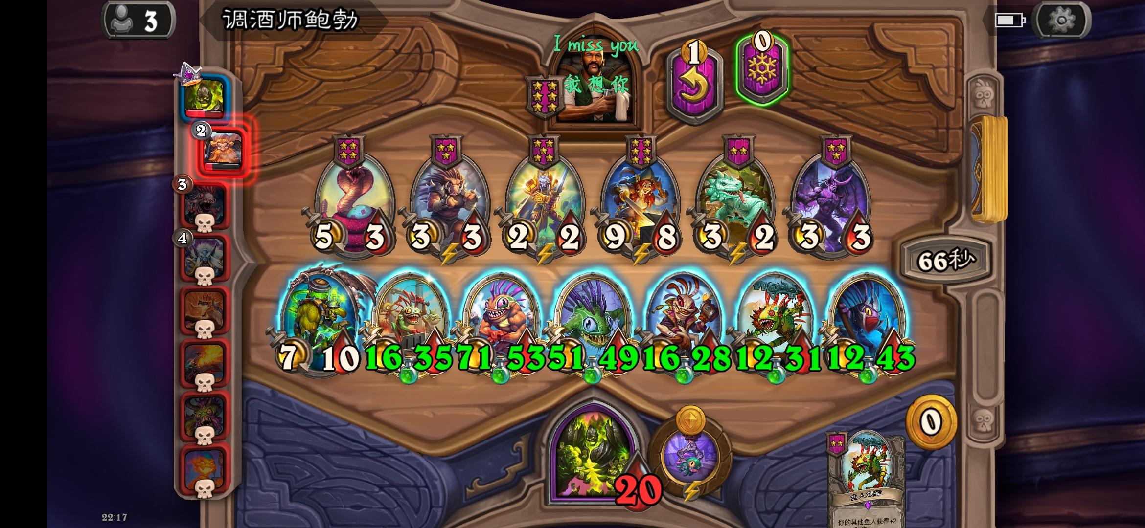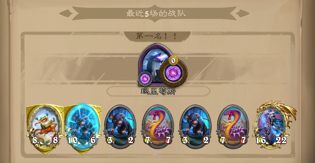 哎嘿,决赛大使好大的风怒猪打的我嗷嗷叫,我26血直接被打了三十多伤害,还好之前5费时候点了寒冰屏障。再战用JK技能点了个螳螂,大眼给了个嘲讽娜迦,一切是刚刚好,直接21点伤害把大使送走了😂,他三个大哥,超级风怒和两劲爆都吃了毒了