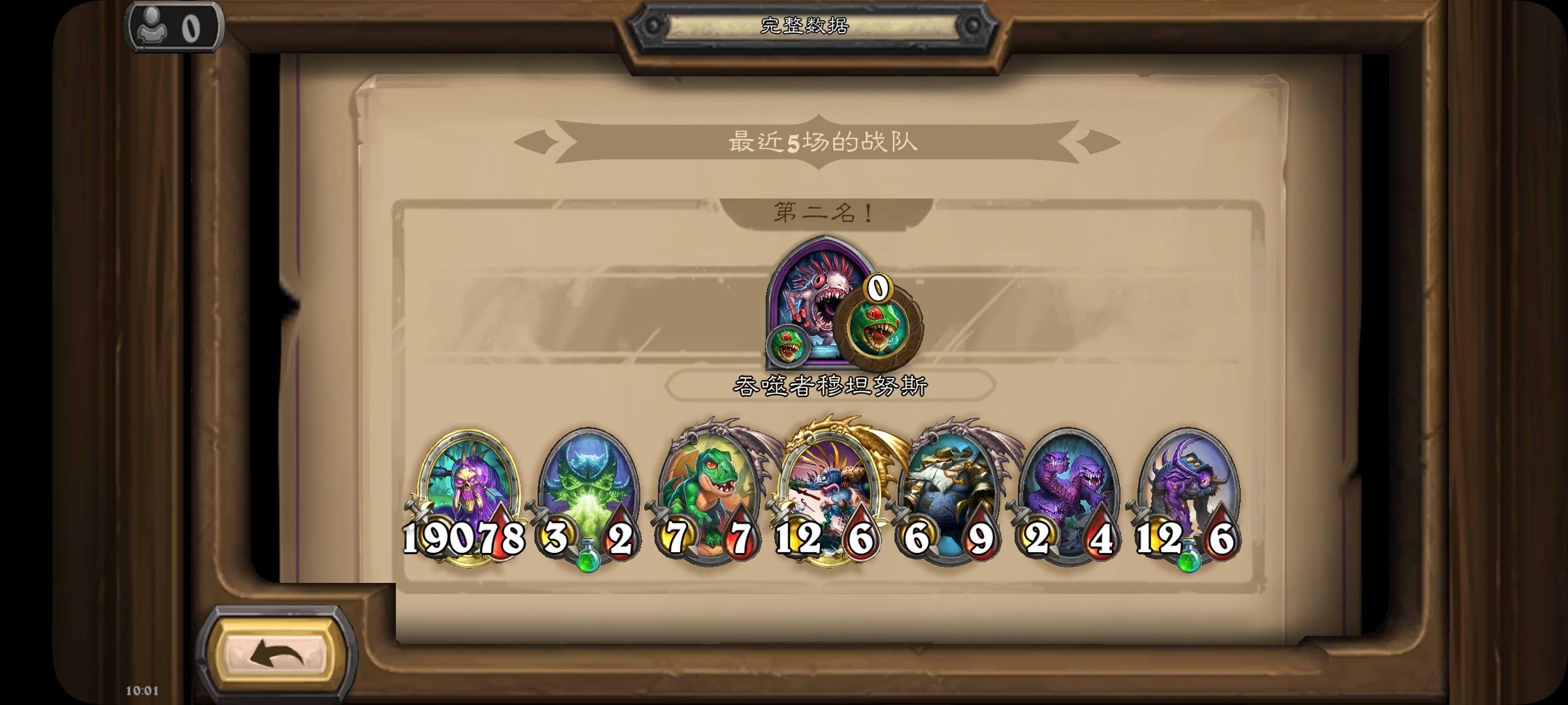 一把运气偏好的大螺丝前期双小粉拉战力,期间凑出一对加血恶魔。靠着高战力小粉,伙伴以及技能同时做出来。四本碰五碰两次出了个光牙(一次小粉一次加血恶魔)之后在四本搜到了掘金者,又把其他恶魔换成了圣盾随从。升五后把掘金和金了,把小粉换成了搜到的暗牙(结束前四回合)决战把光牙换成了金小黄。愉快吃鸡