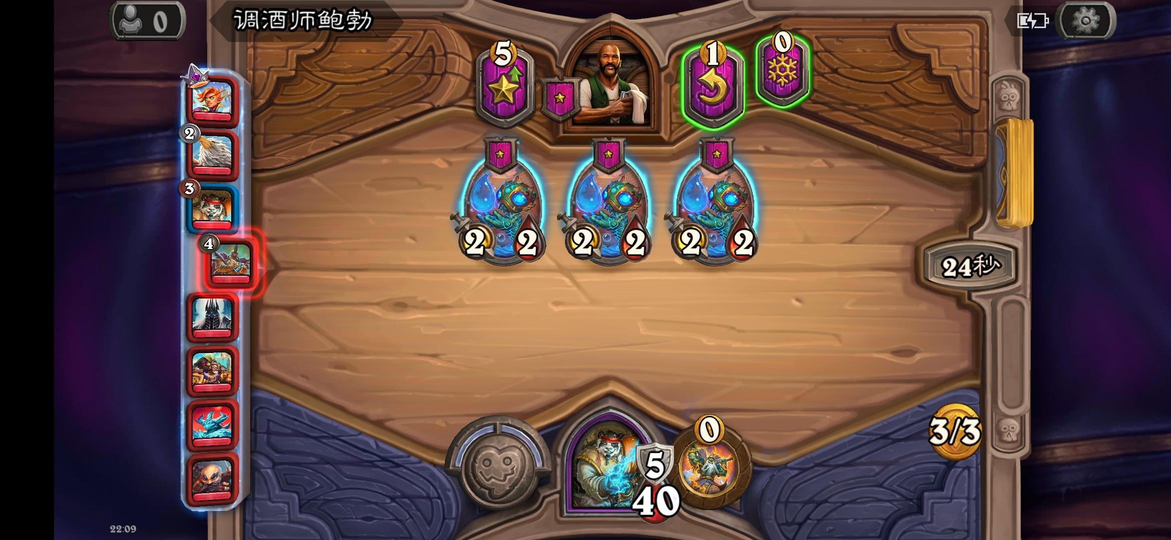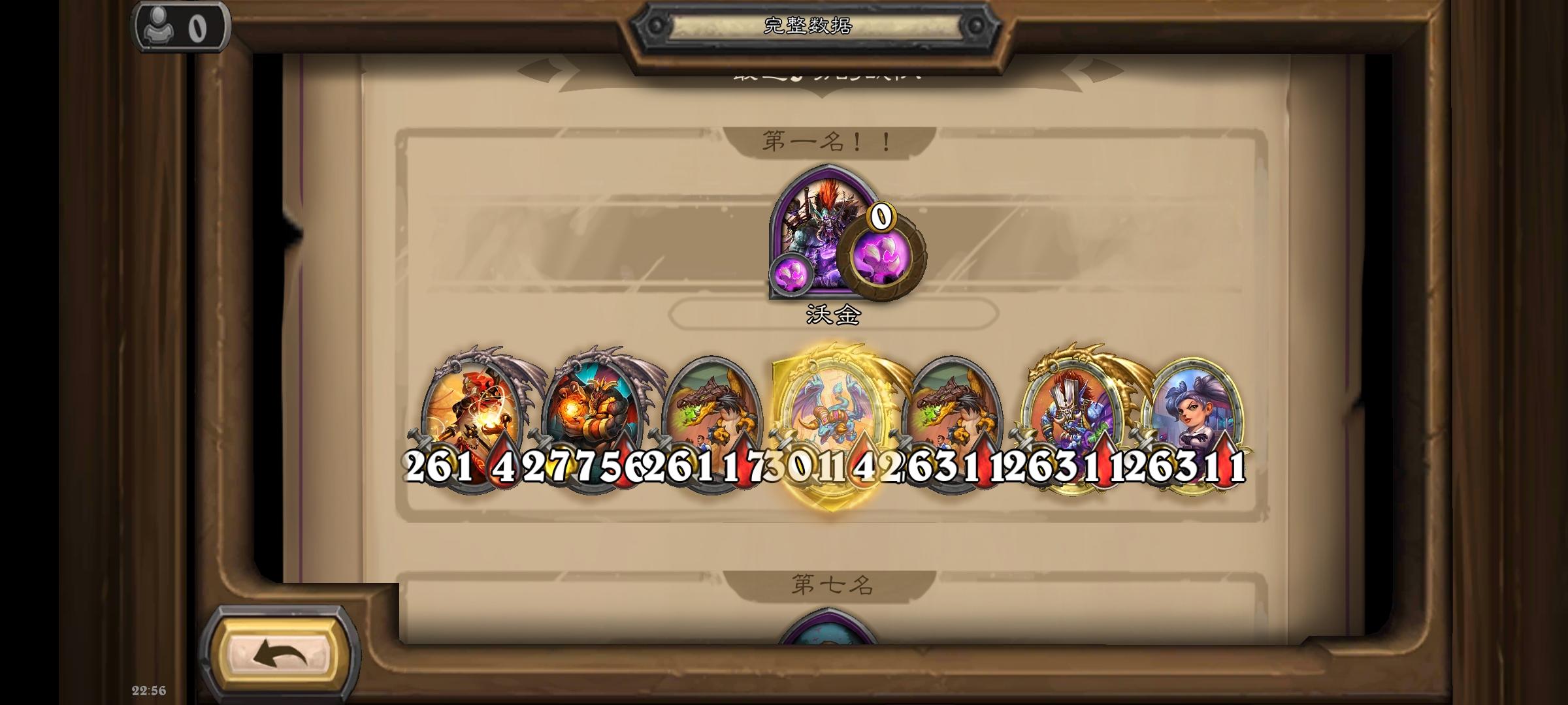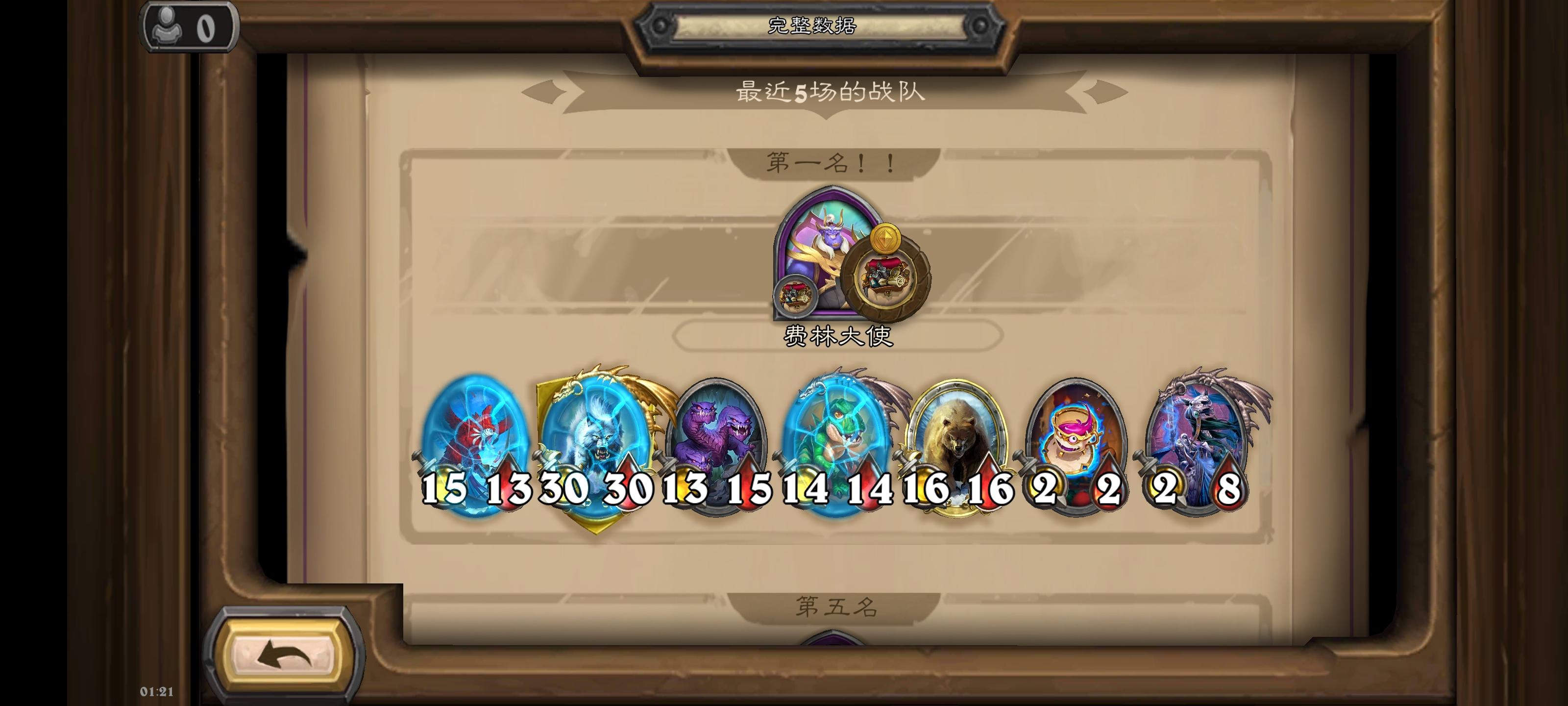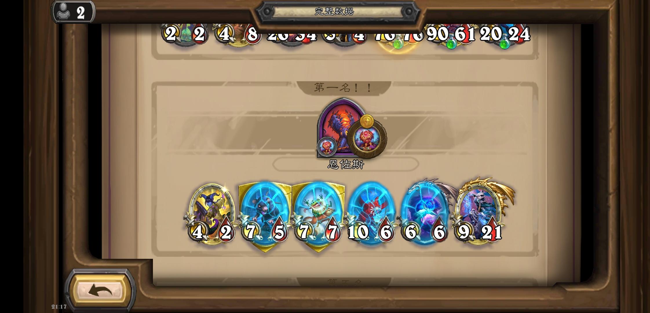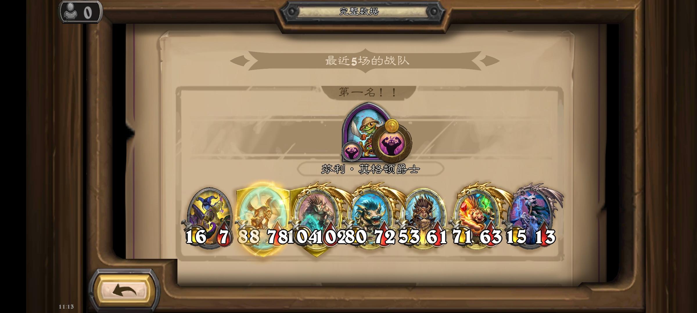 这把运气不很好但也不差开技能开到的白狼。前期靠嘲讽以及那个嘲讽挨揍加身材的怪锁血。10血升六。期间在五级停了两回合,找到了俩熊妈以及一张新五本牌。在六本找到了铜须,开剩下的两张伙伴整到一张鸟以及一个瑞文。六本又找到俩白狼。决赛打一家平均身材70多的糯米元素,靠着新五本牌的复生极限斩杀。