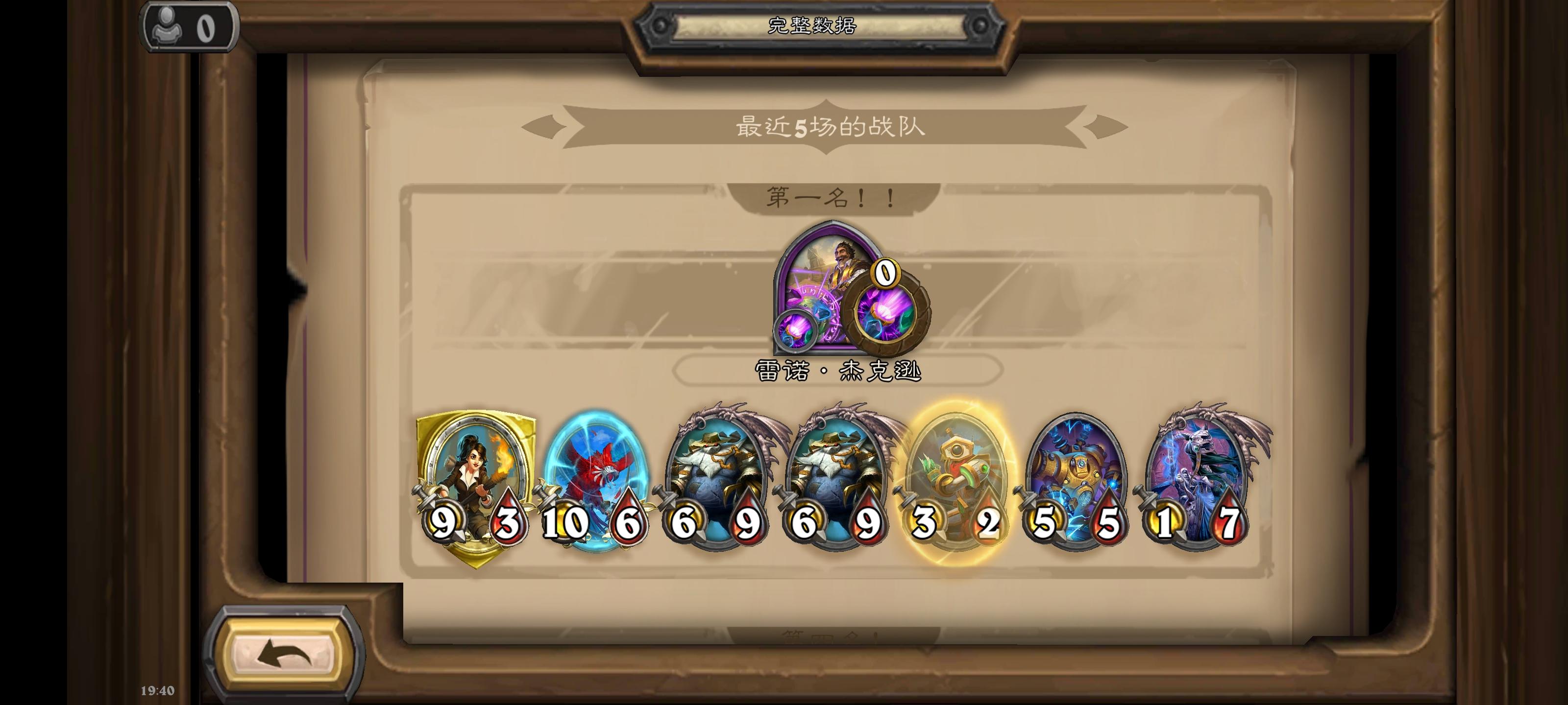 邪道雷诺建议有野兽和机械这么玩。这把前期一本道,运气比较好,碰四出了坦克。于是用坦克和一堆亡语随从以及复生嘲讽锁血冲本。金伙伴升五,碰六出了欧米茄,开始走机械流。在五本搜了几回合出了鹦鹉,直接把鹦鹉点金了,之后在六本搜出瑞文。直接毕业。剩下的机械随从随便凑了凑,这把也没有天胡的跳操电表之流,愉快吃鸡。效果全打出来机械平均身材能到180(鹦鹉出手两次)针对也好针对,有个猎妈或者超级风怒先出手就难搞了。不过我这边木有。稳妥点建议阵容里去掉一个机械随从,再上个复生嘲讽。