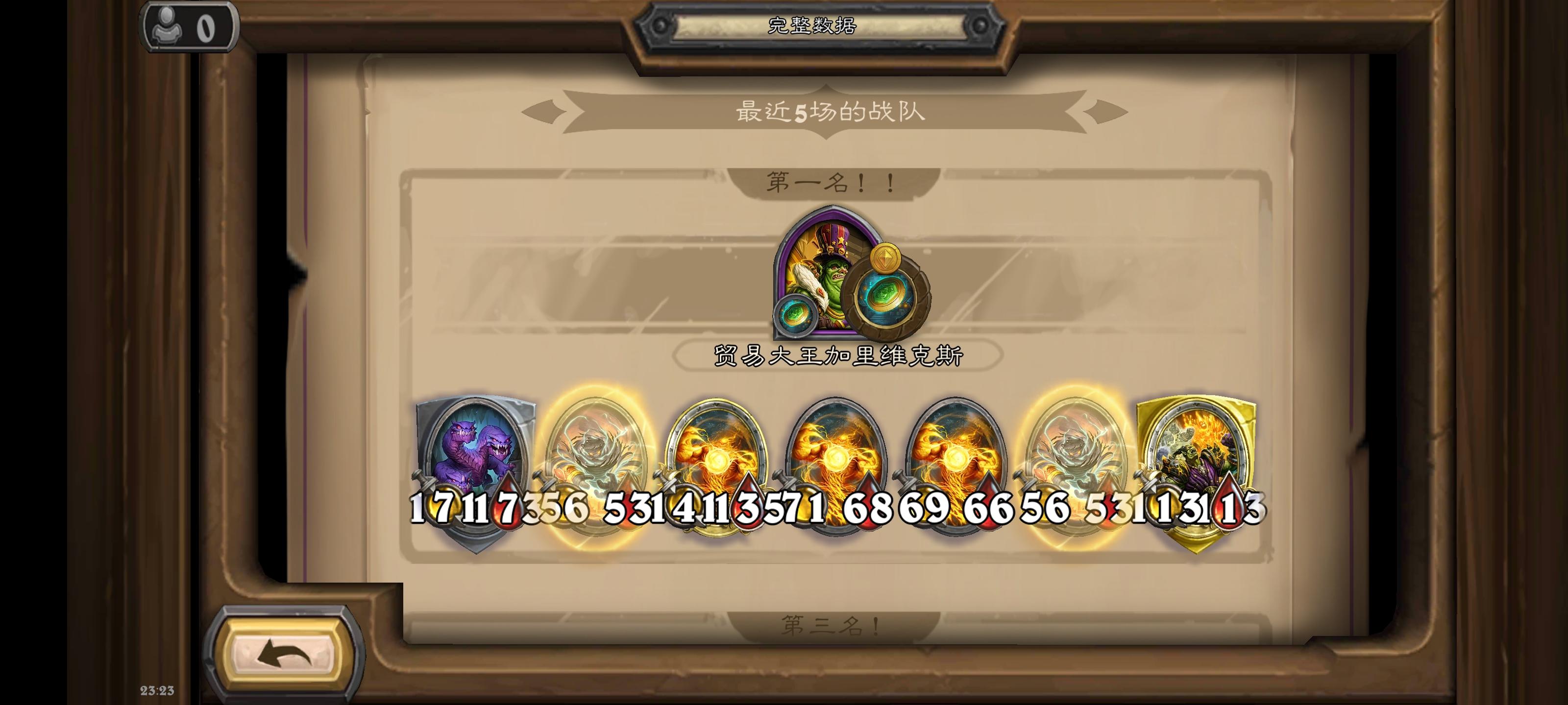 一把不是很顺的贸易大王。前期一本凑对子,碰三次五本随从屁都没出,最好的就是大师。把伙伴用给了狂战迅速升五。五级刷身材加锁血在同一回合找到了铜须以及糯米,当时场上有俩人被淘汰,用剩下俩伙伴加完身材后,放弃铜须,搞糯米元素。靠着叉子,狂战,超杀元素以及大师苟住了血量。在六本把糯米合了金,最后决赛打鱼人,吃鸡