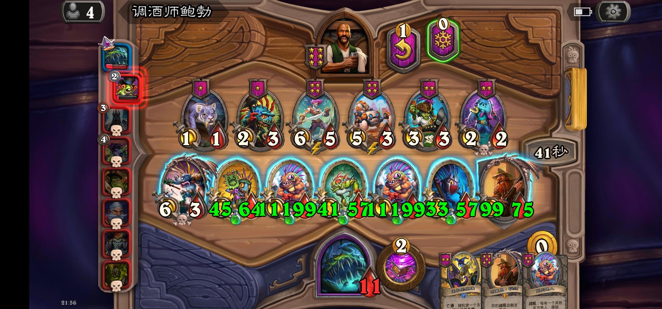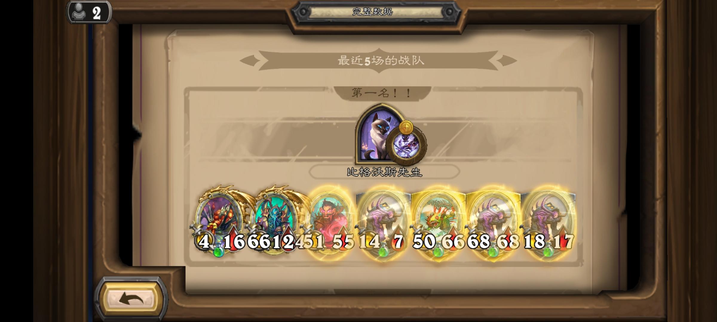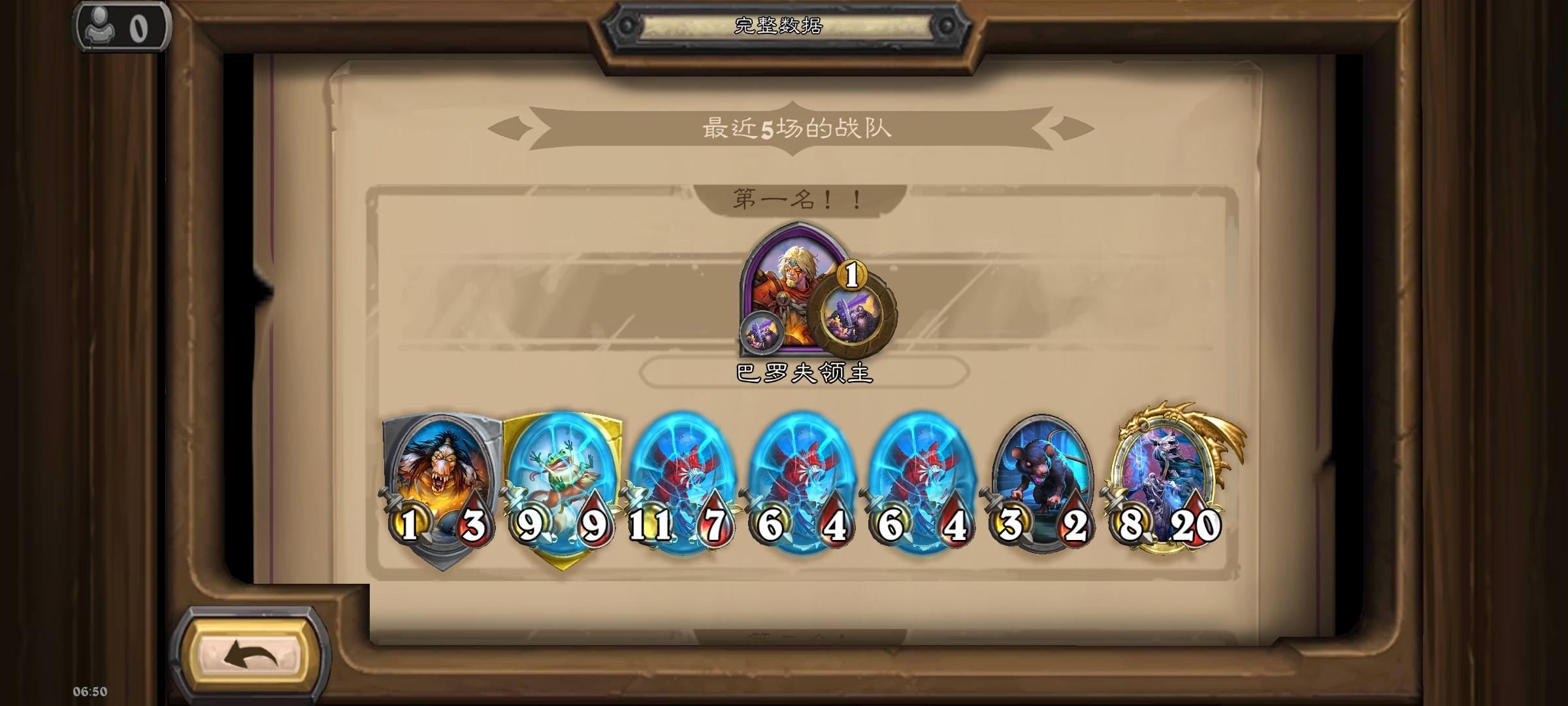 打了一天,最好名次第二名。实在搞不懂伙伴进度由什么决定的,有玩家6费的时候伙伴就出来了,自己前期明明一直赢,挒个9费出伙伴,莫名想笑。酒馆能不能搞两个模式,一个有伙伴,一个没有。