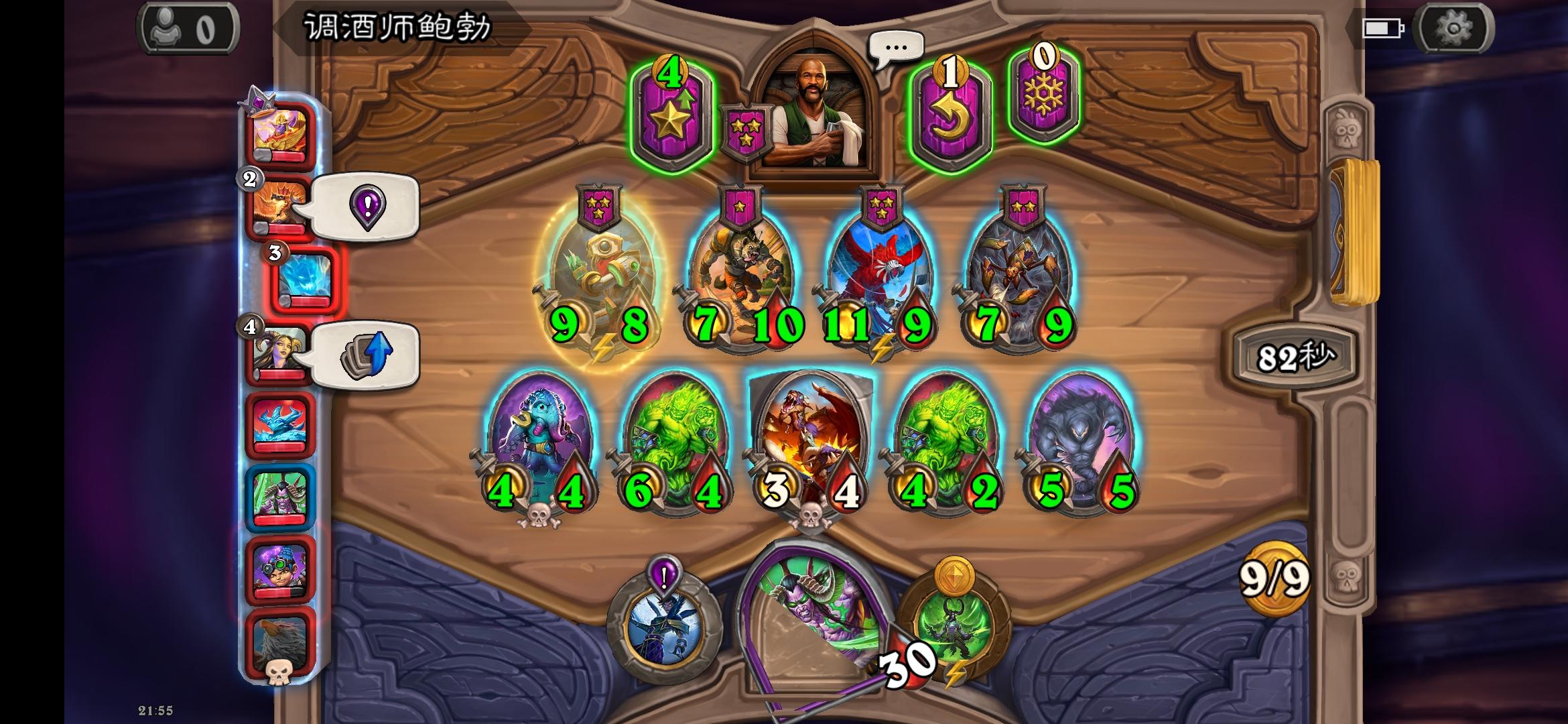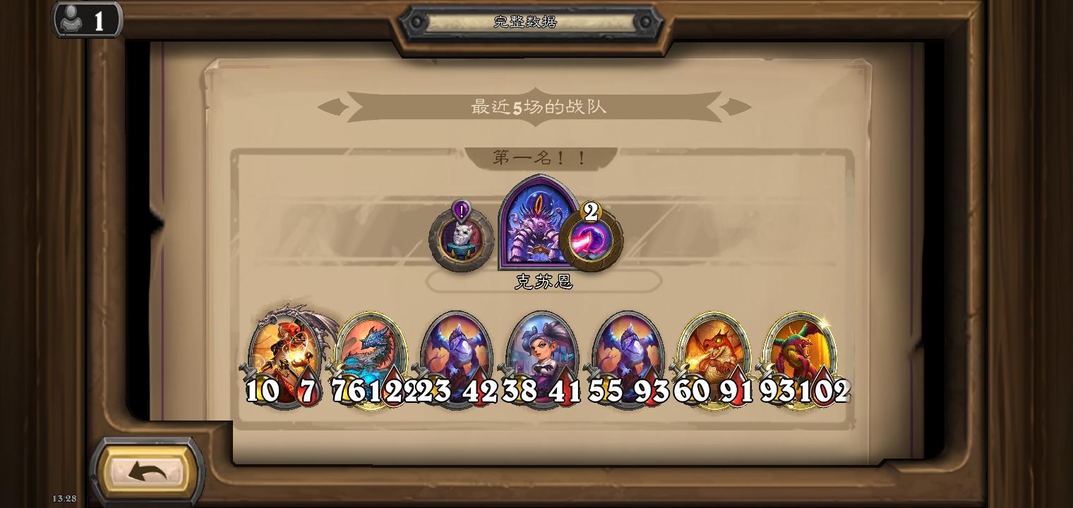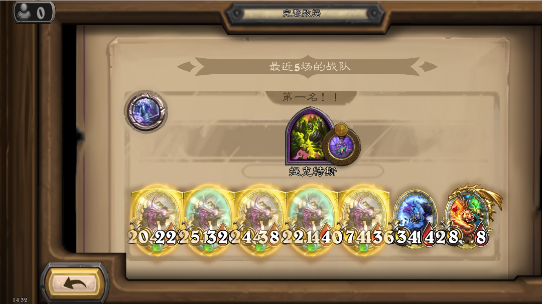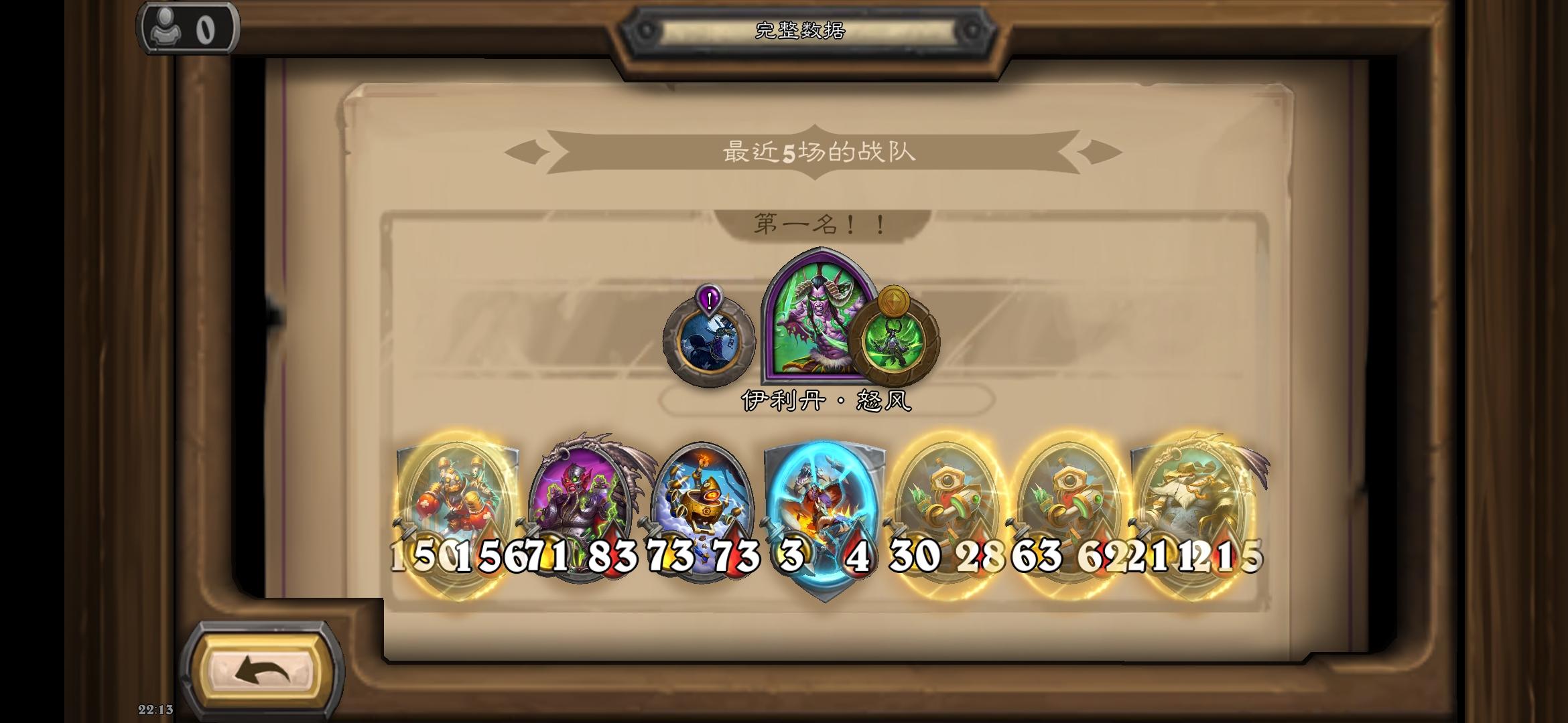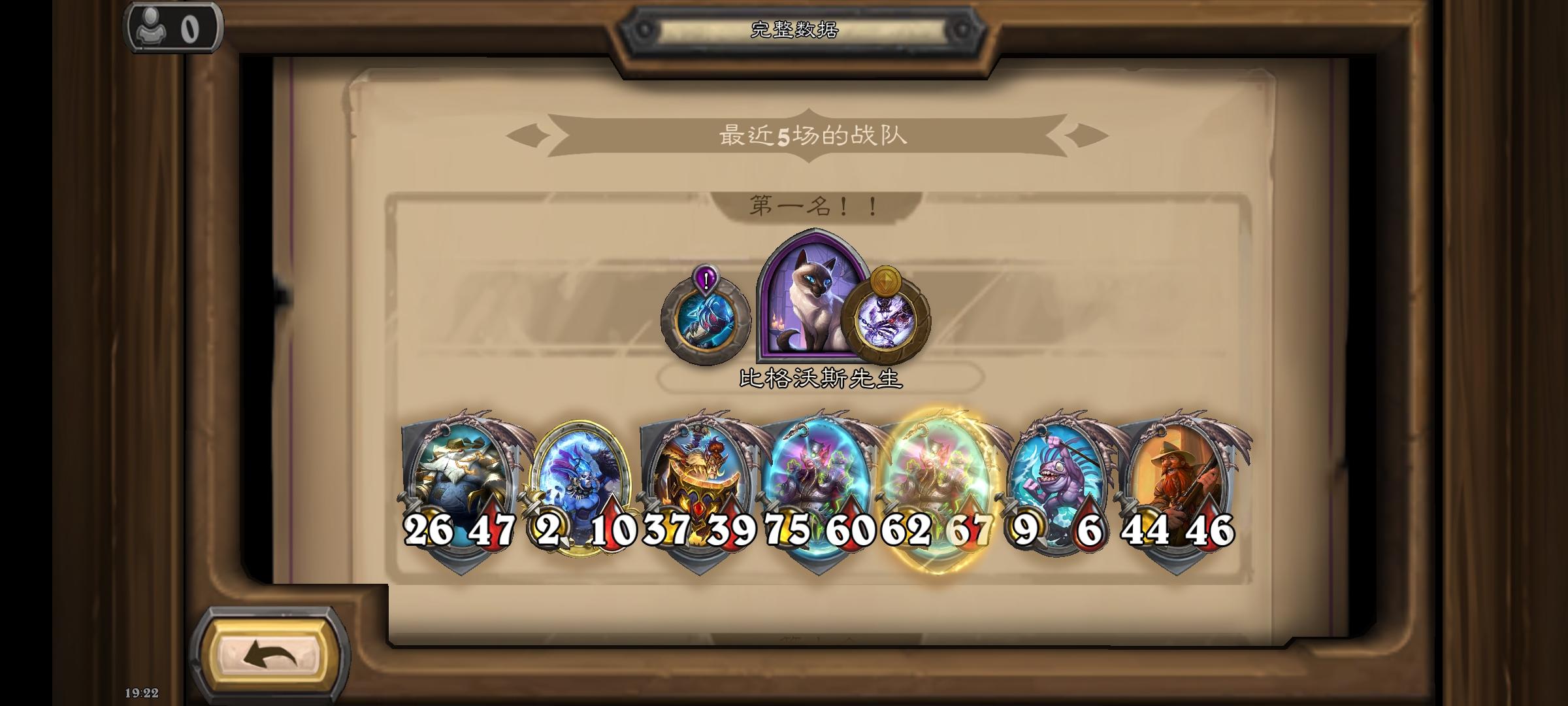 一举破我最高记录,11亿身材随从,第2个回合卡牌换技能变成每3回合回合结束时复制最左边的手牌,第,第4个回合给了奥秘哥随从,回合结束时触发发现一个奥秘,后面金色1-5(回合结束效果触发3次)+双瞎眼+B-box转机械结果找不到恶魔磁力,身材才40多完全赶不上其他人,当时冰箱都炸了,感觉要没了,没想到不知道谁选了个金色自大狂,我触发3次直接3金,后面又有人选从上一个对手战队获得一个随从,直接4金自大