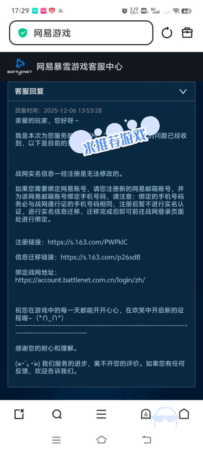 图1 昨天还在玩,早上想玩把酒馆,就登不进去,一直要关联账号。图2 自己试了好久,微信小程序、大神app……什么的,因为战网跟网易身份证实名不同,不能关联。就想着找客服,看有没有其他方法,然后发现点客服就要先登录,要登录账号就必须关联才能继续,循环了好在还是找到了图3 最上面红字,点进去输手机号。图4 后面客服给我发了个关于迁移账号的消息,身份证、手机号一样才能关联,不一样