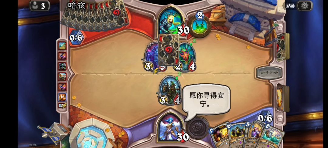 网络质量良好,手机没有问题,在对面回合时贼打出了暗影步准备回收海星(视频中卡在半空的卡)。突然画面就不动了我以为是对面还在思考,结果过了两三分钟了还这样,后面居然发现对面有箭头飞过来。我笑了,终于炉石的bug也对我下手了…