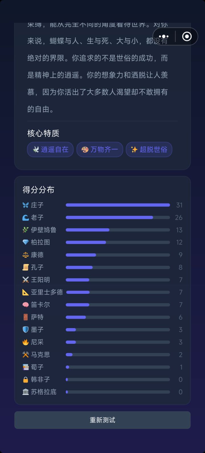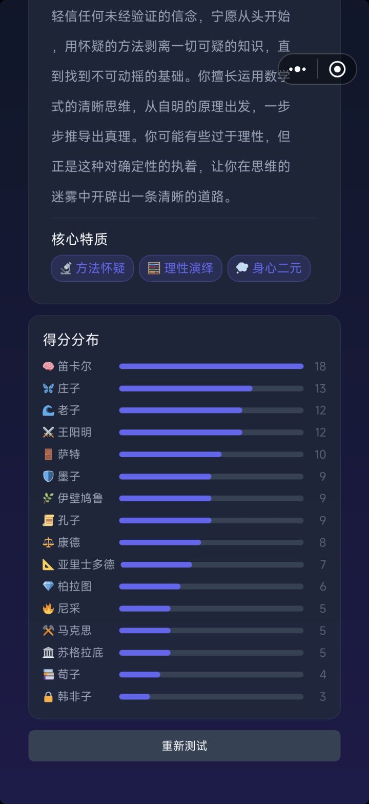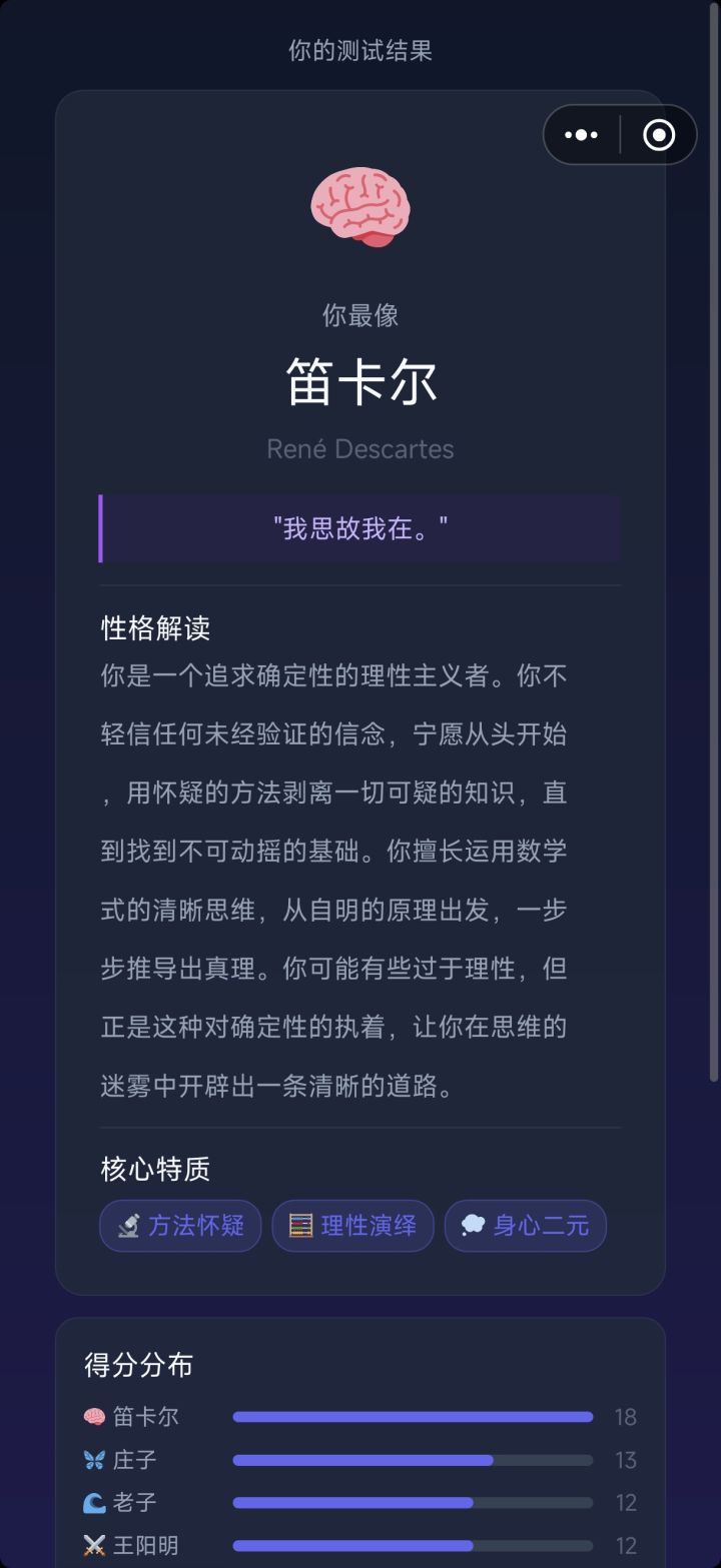准倒是还挺准,我确实挺烦人的,只不过这里面哲学家太少了,欧陆里面都没几位,只能说做着玩还不错,按照主流哲学史来看是缺了现象学(这个是真的完全缺一个代表人物,甚至题目里面有偏向现象学的选项),宗教学(奥古斯丁,伪狄奥尼索斯,阿奎那)怀疑论(休谟先辈被康德肘翻了,太伟大了三大批判😭),泛神论(斯宾诺莎),法哲学(施密特,卢梭,洛克,霍布斯等等,当然还是如果,如果柏拉图的正义论(理想国)算的话但是我觉得