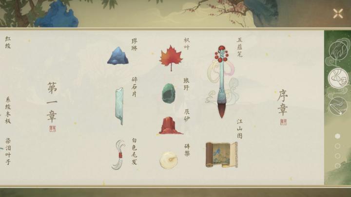 序章 妙山图鉴一览:过了剧情后,获得第一个物品:江山图。别急着向上走,点击画圈的地方,收集到第一个印记:琅玕沿着河往上走,又是一段剧情,过完剧情不要急着和小男孩对话,先点击水池里这个石头,收集第二个印记:璆琳剧情之后,从藤蔓爬上去,走完第一段阶梯,在下图画圈处找到:第三个印记:砗榘这里不太容易被发现,直接走上来的时候容易被枫叶遮住,建议往前走几步之后再往回走几步,才容易看到。然后顺
