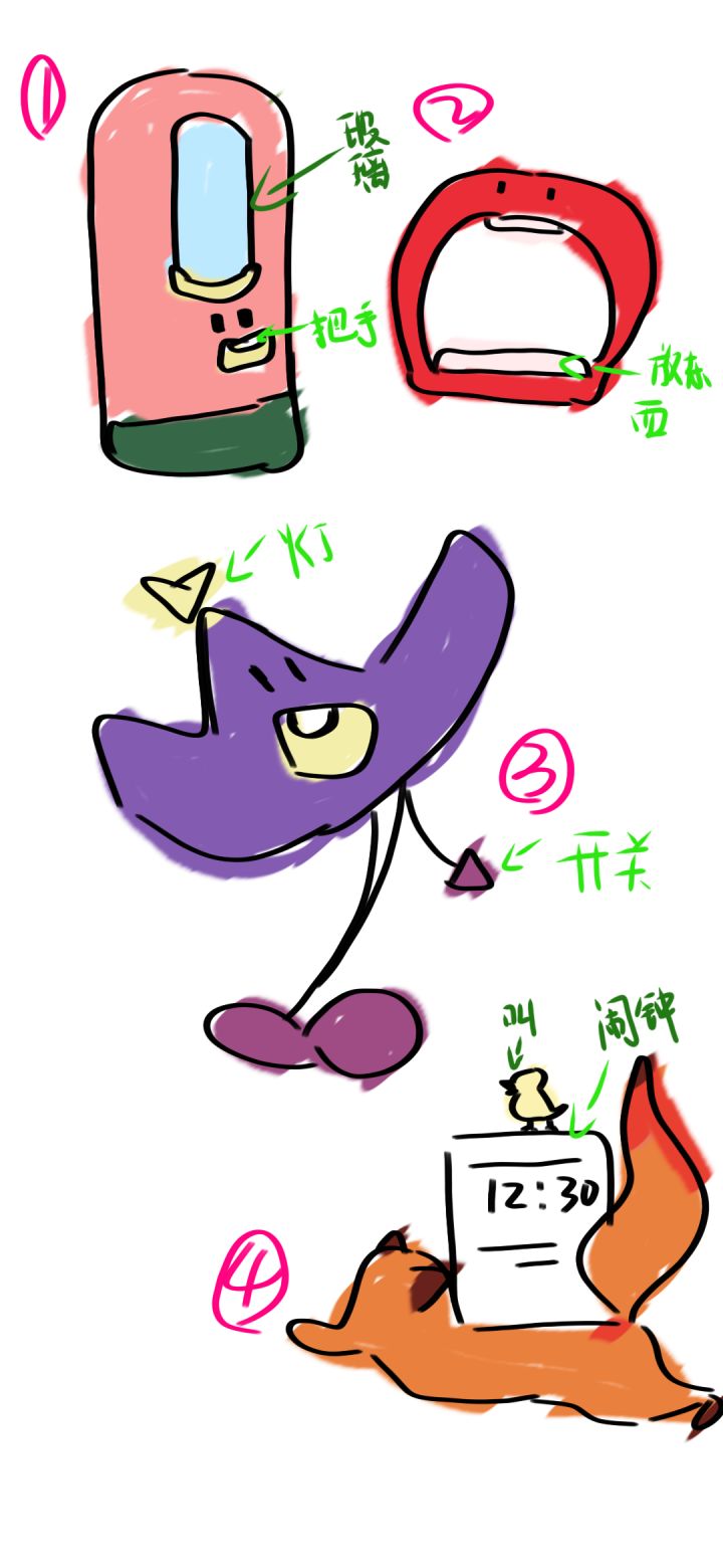 1,大门牙门,嘴张开的牙是门把手,整个门都是木的,蓝色是玻璃,2,大门牙窗户,下面牙可以放盆栽。3,大门牙灯,是一个女巫帽的形状,点击开关,黄色的部分会发光。4,狐狸闹钟,狐狸趴着,背上放着闹钟,到时间闹钟上的小鸡会叫。后面还有几篇,先放两篇平常设计