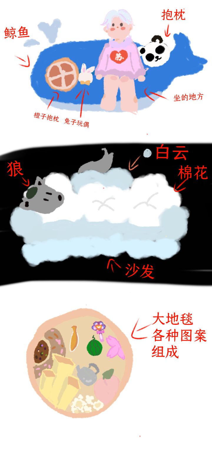 两个沙发,一个由各种图案组成的地毯。猫咪玩偶摆件。一个摇篮,旁边是太阳伞,伞上一个兔子在休息。两边狗狗在看。一个收音机。一个钟表,到点下面四个球会摇晃。皱眉月亮座椅,下面标牌今日登月。