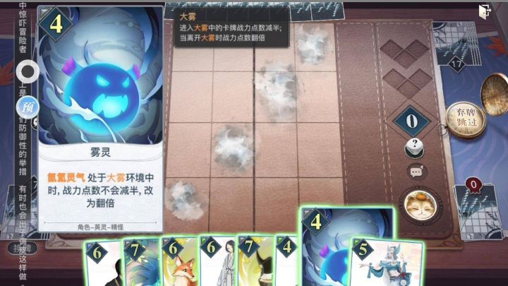 天时、地利、人和,三者不得,虽胜有殃。 ——《孙子兵法》原理想明白这个操作得写提前了解,大雾地形到底是什么机制?大雾:进入大雾中的卡牌战力点数减半离开大雾中的卡牌战力点数翻倍ps:经多次测试这个效果优先级最高那么接下来就是见证骚操作的时候了。万事俱备,只欠大雾。不小心雾灵放错局势不妙……战力也处于落后状态。不慌先手镯+4点增益效果万事俱备,只欠大雾。此时,雾灵在场8战力,受