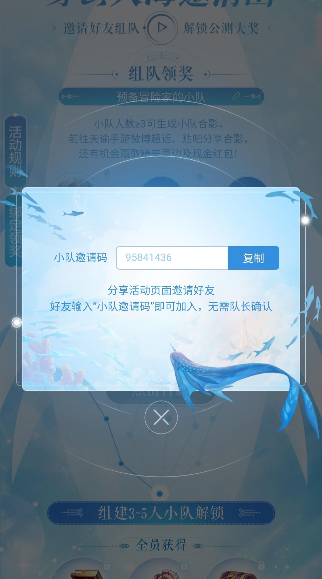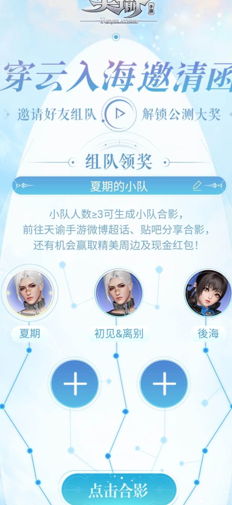 团队邀请码:55670599欢迎新来的好友鸭,纯萌萌萌新,还有小伙伴嘛,附上链接喔,【网易】网易年度开年巨作《天谕》手游,全平台公测定档1月8日,iOS用户可前往AppStore抢先预订!千人同屏空战、经典硬核副本、数百小时冒险奇遇任务......穿云入海立体幻想大世界等你来体验!点击: https://url.163.com/zEp ,邀请好友组队,即可领取永久限定饰品、绑定天玉等海量公测奖励,自己当队长奖励再加倍!分享小队合影还可赢取周边及现金红包! 回T退订来自TapTap