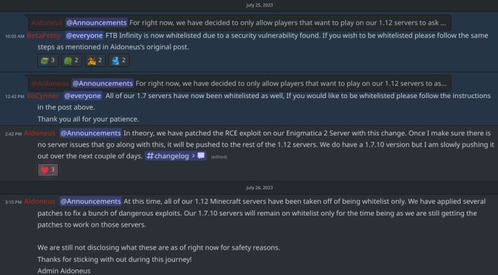 摘要根据 和 所述,已在许多 Minecraft 模组中发现了一个非常严重的漏洞,允许在客户端和服务端(甚至服务端上所有连接的客户端)上远程执行任意代码。如果您安装了本文列出的模组之一,则应该假定您的设备已被感染。此漏洞主要影响 Forge 用户,但 Fabric 及其他模组加载器仍然可能受到影响。服务端 RCE 漏洞(Bleeding Pipe)在野利用风险警告我们建议您(尤其是服务器#游戏漏洞