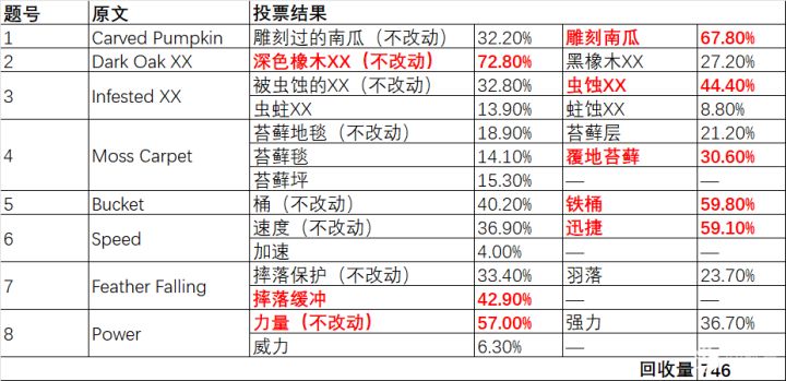 投票问卷发布一周后即3月11日,此前的停止收集,现公布结果。本次投票问卷共回收746份。投票结果如下,对译名做出的更改已经在最新Java版预览版里应用。感谢大家对翻译工作的理解与支持。我们下一阶段见。MC译名讨论委员会2023年3月11日#杂谈征稿#我的世界#Minecraft#译名投票