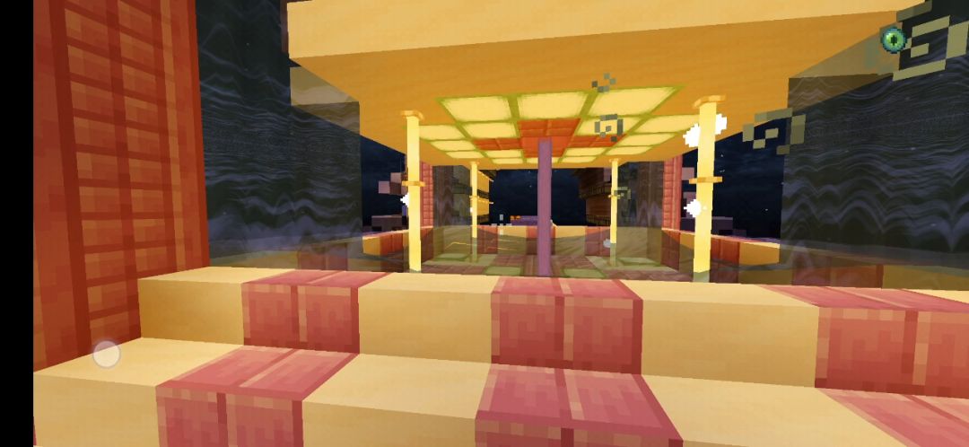 中的洞是传输物品用的,站在旁边往水里丢物品就行了,灵感来源于很多年前在多玩下载的一个地图《彩虹喷泉》。但他的喷泉是斜角的,为了解决水流问题只能在内部加一层石英台阶。隔断水流本来想用末地烛,但发现末地烛不能断水,所以被迫用了玻璃板,不过效果好像增强了。亭子灵感来源是xgz推荐的,我本来想用彩色玻璃修一个类似于灯罩一样的建筑,但xgz想要亭子所以就建了个这,利用紫珀和平滑石英建出了华丽和朴素的混合感?至少我觉得还可以的。