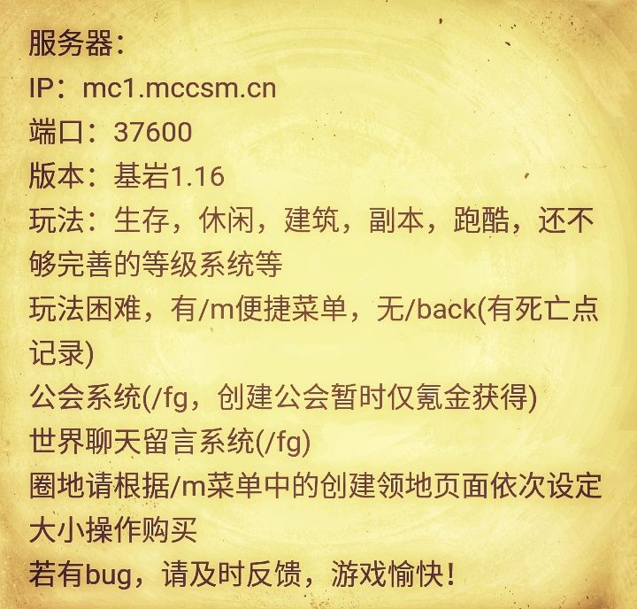 瑾告烦恼多多拥有奇才的少年少女们若对自身之才能有心一试就将己之家族 友人 财产 以及世间一切抛之脑后前往吾等之服务器……1.服务器是收费的(防止炸服之类的),一个季度10块,即三个月10块2.提供mc国际版基岩版手机端游戏,无需自备3.规矩不多,不炸服不偷东西就可以,另外帮忙建设的话会给好东西的4.地盘问题,别随便动别人建筑就好,找个没人的地方想圈多大的地都没人管以上