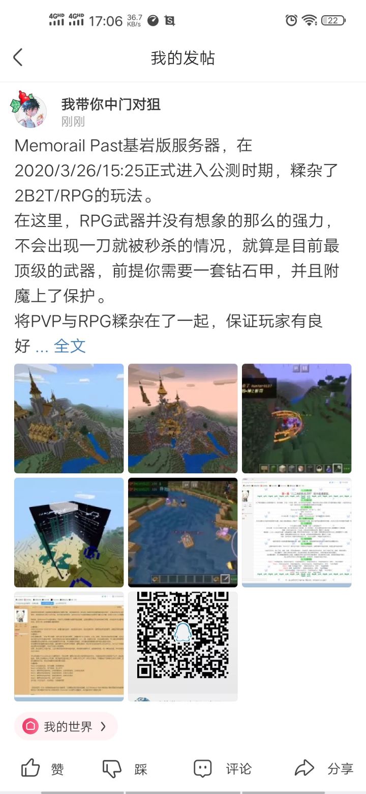 Memorail Past基岩版服务器,在2020/3/26/15:25正式进入公测时期,糅杂了2B2T/RPG的玩法。在这里,RPG武器并没有想象的那么的强力,不会出现一刀就被秒杀的情况,就算是目前最顶级的武器,前提你需要一套钻石甲,并且附魔上了保护。将PVP与RPG糅杂在了一起,保证玩家有良好的游戏体验,身穿RPG防具,手持RPG武器,在资源世界内发展属于自己的天地。武器不够强力,防具不够强力