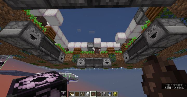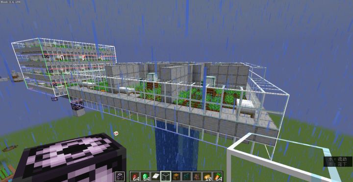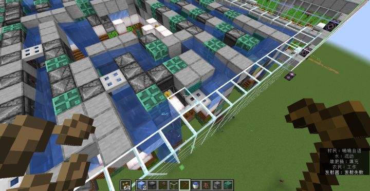 要不是考虑农民背包里种子的消耗,我其实是不想做种子补充的,因为这玩意稍微有点花时间,需要做回收:种子分类,传输,定时(每分钟1个种子)投送。布线才是体力活!当然,多余的种子还是会销毁掉,虽说有分类机不会有爆仓的风险。。。。除了这个农场,接下来比较麻烦的恐怕就是建造完各自农场后的组装了。。。。。一旦选择堆叠成一个东西,串线和信号错误就是难以避免的。。。。为避免铁傀儡和猫等生物的生成,搞完后得多弄