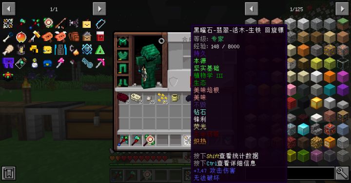 匠魂 II 研究进度,用新的材料造了个十字镖,照明和饱腹的技能很不错,耐久打满了