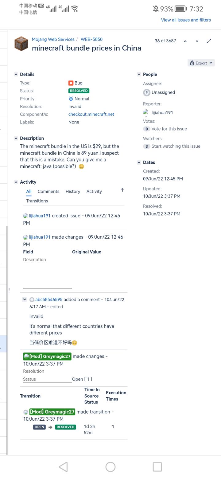 一个用户名为“lijiahua191”的用户反馈了此问题,但工作人员似乎因为此人 “Can you give me a minecraft: java (possible?)” 而关闭了这个反馈(标记为无效)