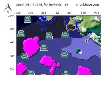 种子推荐Bedrock SEED:651152765x,z:0,坐标点一千格内9个海底神殿还有大片的蘑菇岛