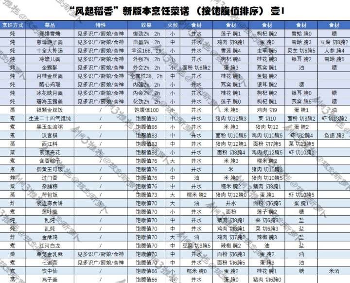 推栏独家-新版本烹饪菜谱 绝赞方案汇总(搬运自剑网3推栏)在上一篇烹饪基础玩法攻略的最后,有提到新版本正式上线后会尽快为大家整理出新的菜谱,现在来兑现诺言了!通过把小伙伴们 坑蒙拐骗 来跟我一起 两顿没吃 爆肝试错 浪费材料 全身心投入积极尝试,终于弄出来了(滑稽)。有错误欢迎评论指正!新菜谱与之前大体相同,只有少数微调,主要是盐和糖方面。井水改为杂货商购买,300金一个。增加了火候、