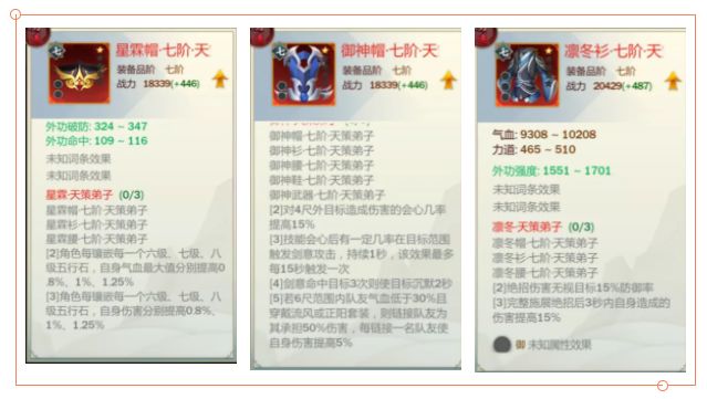 本期天策弟子的配装攻略由藏料山庄 · 曙天缀宿大侠提供,3妹整理分享,仅供参考~PVE属性推荐养成期间配装上半身配装:星霖/御神/凛冬/暮川/琅阁下半身配装:3正阳凛冬/琅阁只用头衣服两件,腰带任意一套旧套装双会牌子即可(无散件情况下)。极限输出配装PVE配装:3半夏3极散/鬼工PVE配装:4鬼工+2衔赤PVE配装:2+2+2其中2+2+2本人不做推荐(全套装在我看来不可能是天